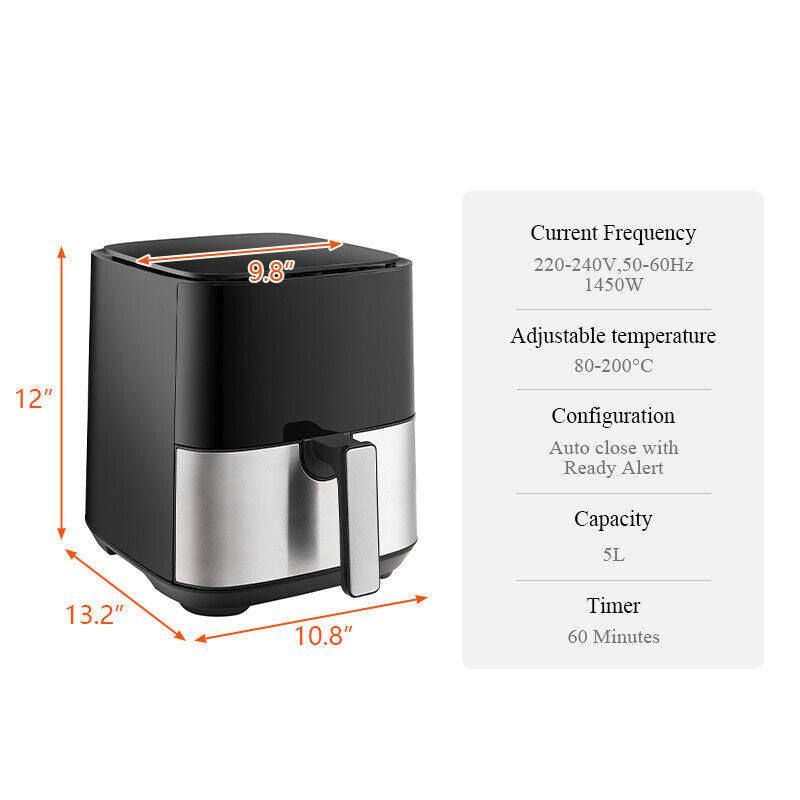 Air Fryer 5L 1450W Power Basket Health Fryer Digital Display Stainless Steel New