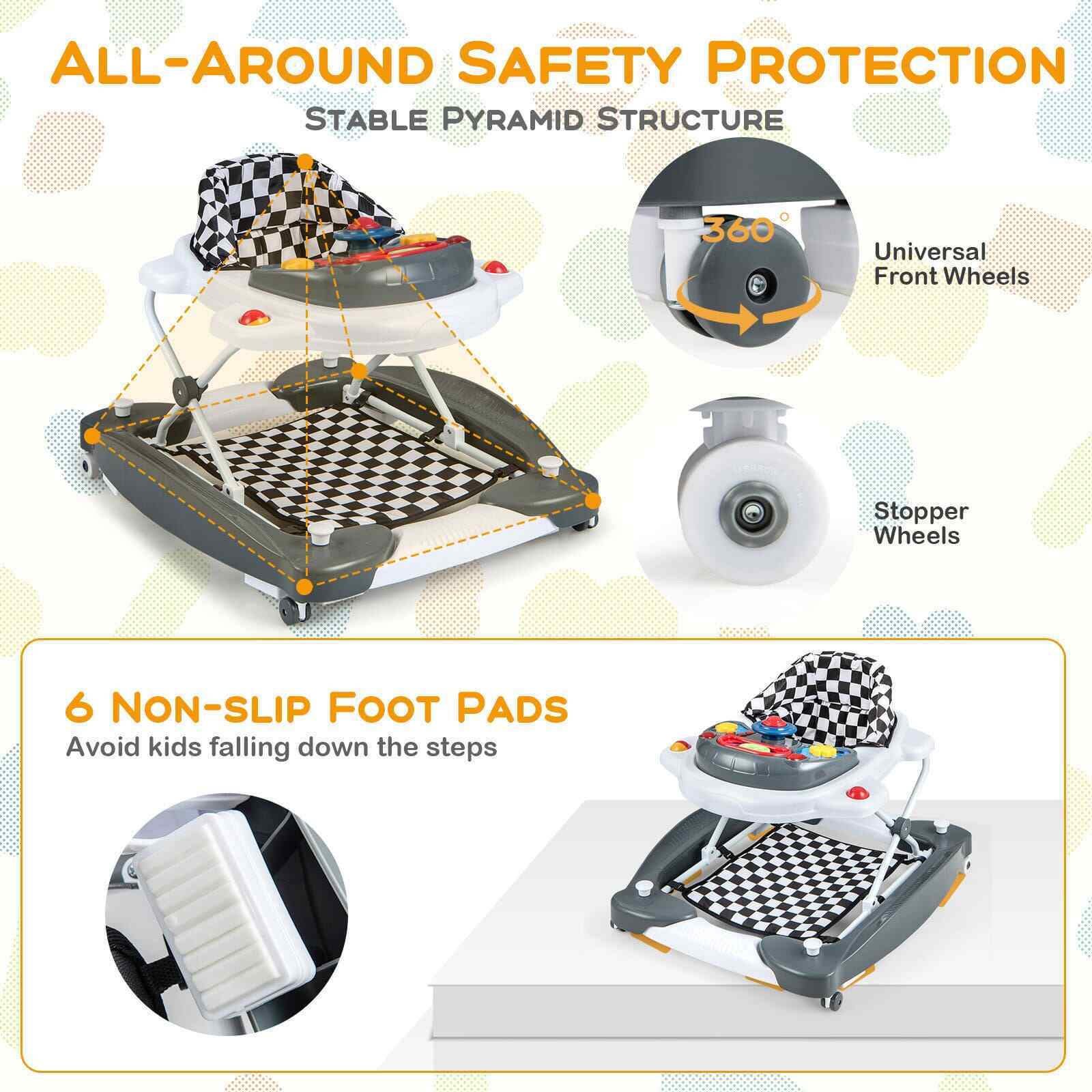 Anti-Rollover Toddler Walker & Activity Center w/ Adjustable Height Grey