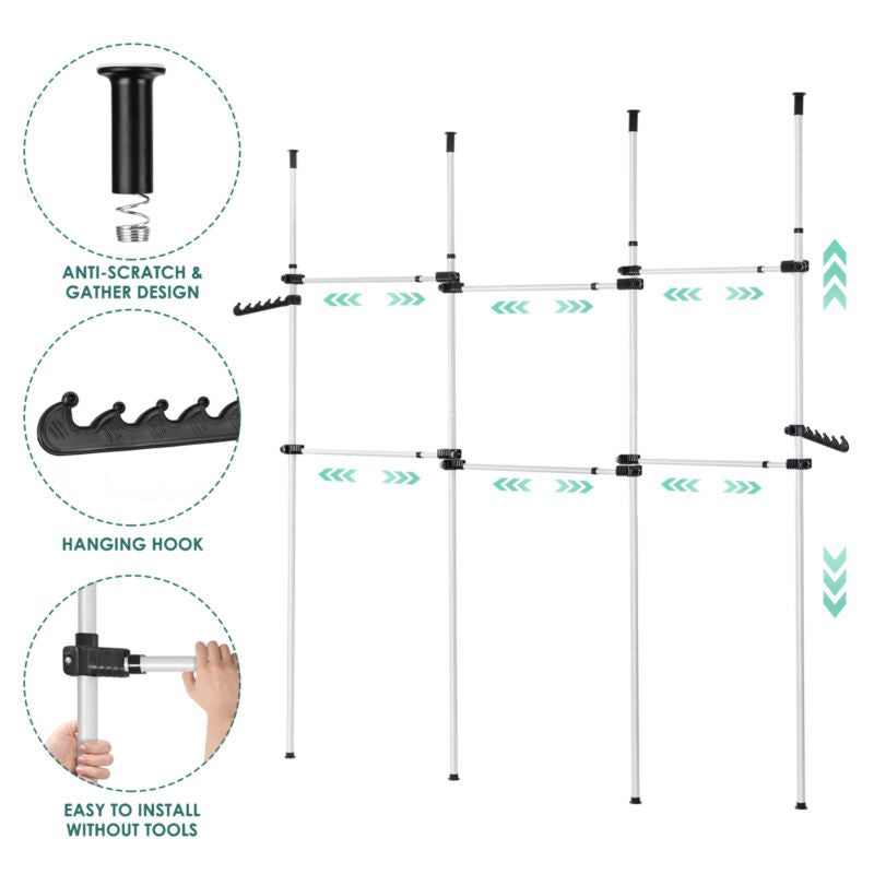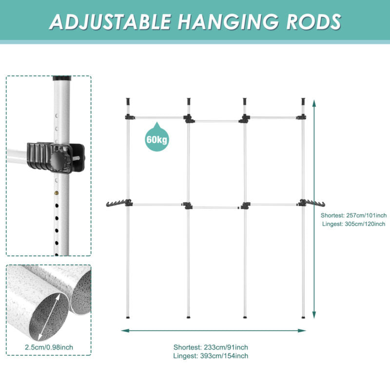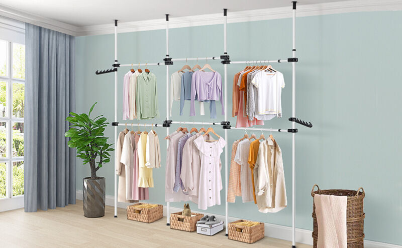 Features Hanging Clothes Rail with 2 Poles 2 Bars, Duty Clothes Rack, Telescopic Wardrobe Organizer