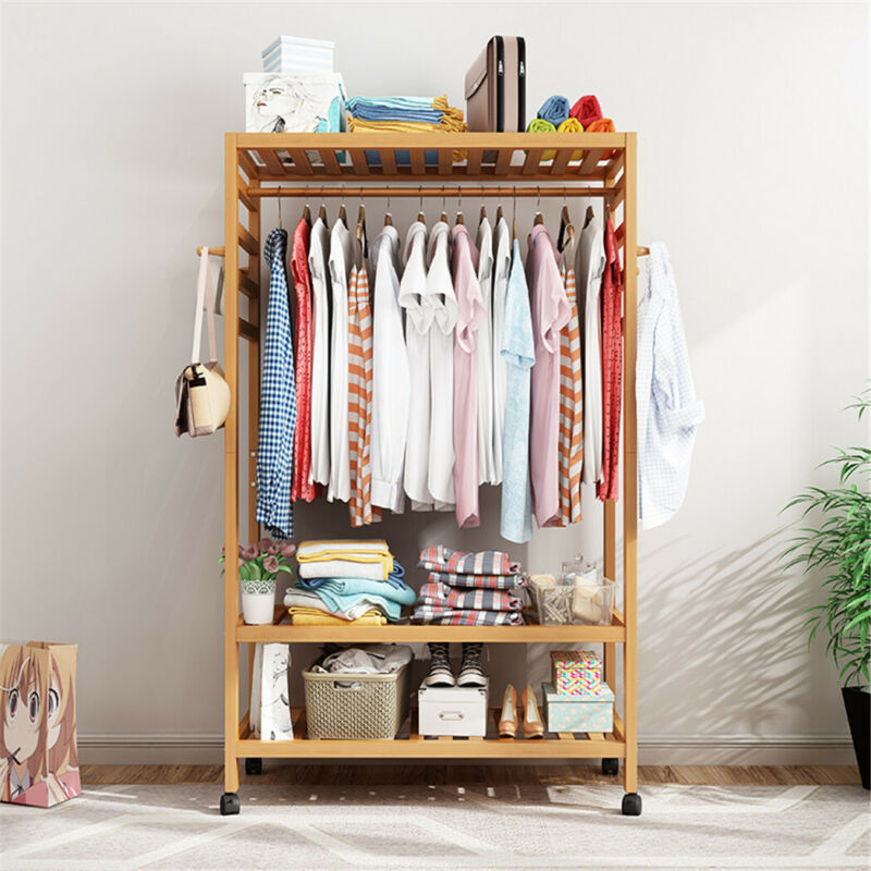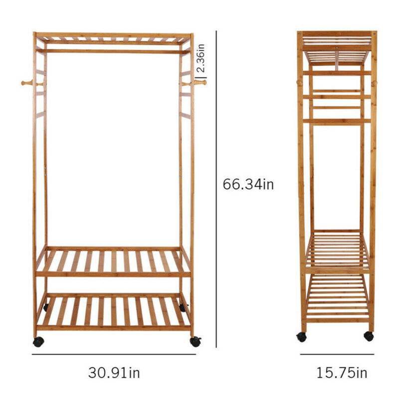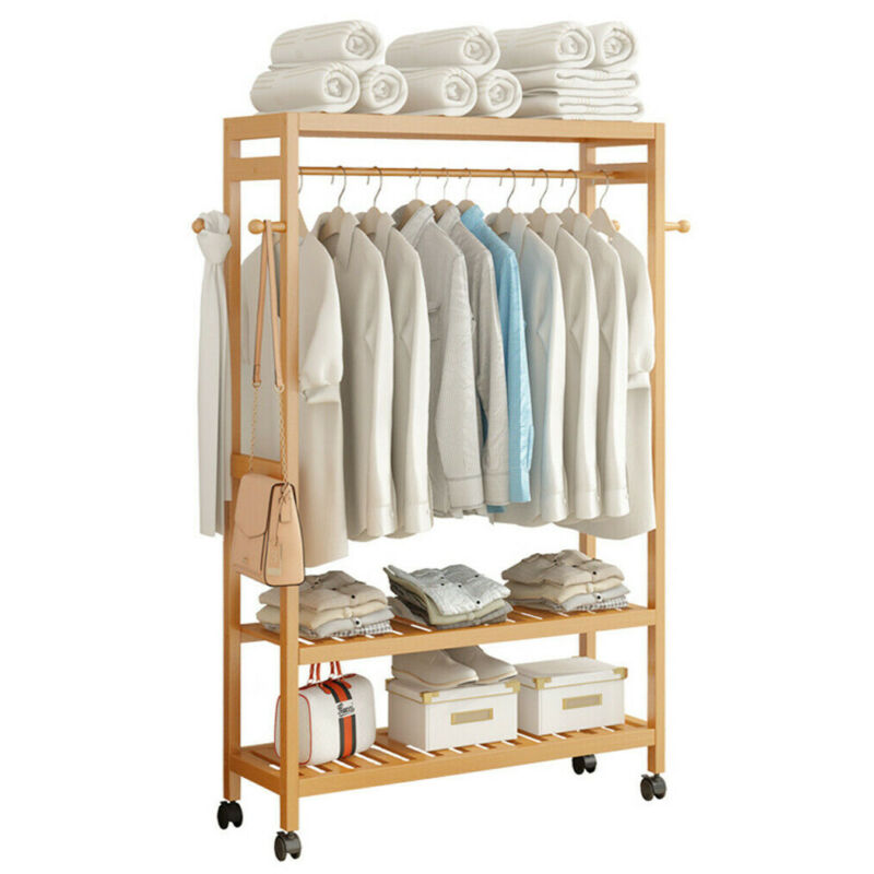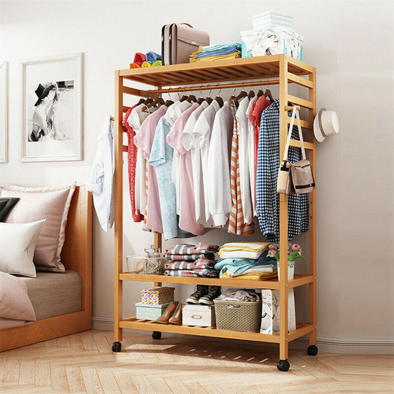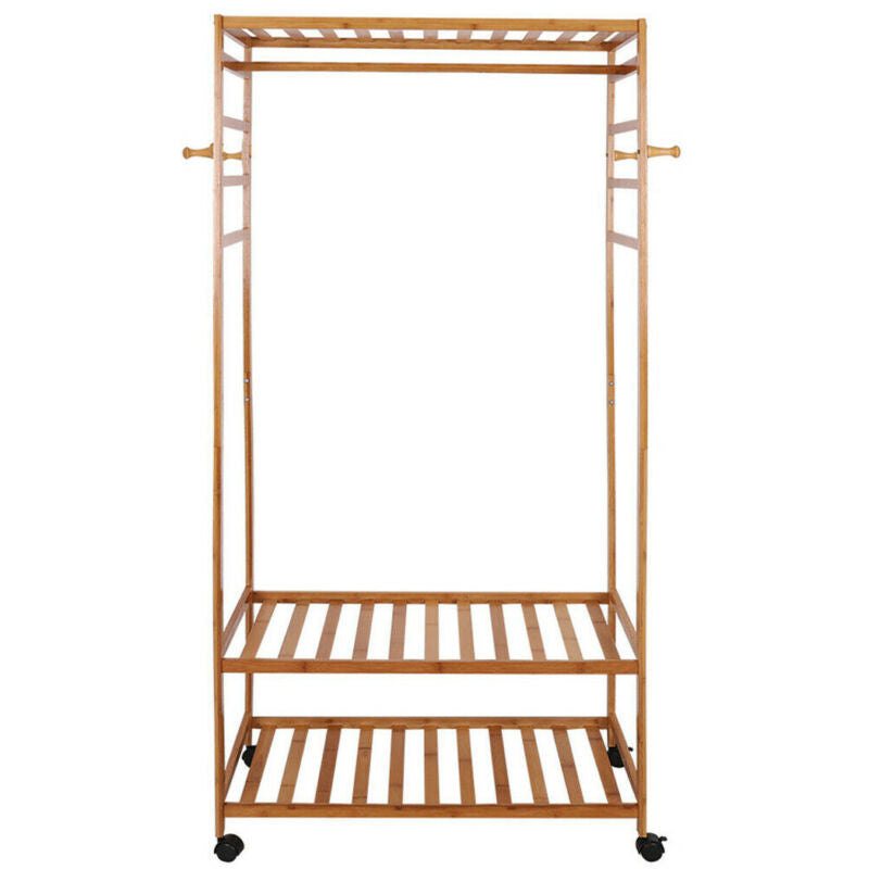 Bamboo Clothes Rail Garment Storage Coat Hat Hanging Shelf Rolling Trolley Stand