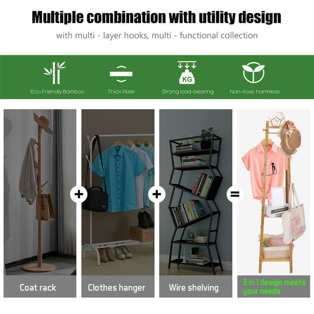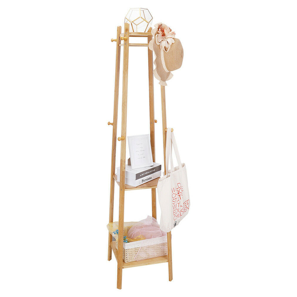 Bamboo Clothes Rail Stand Coat Rack with 2 Ladder Shelves w/Hooks Hallway Sturdy