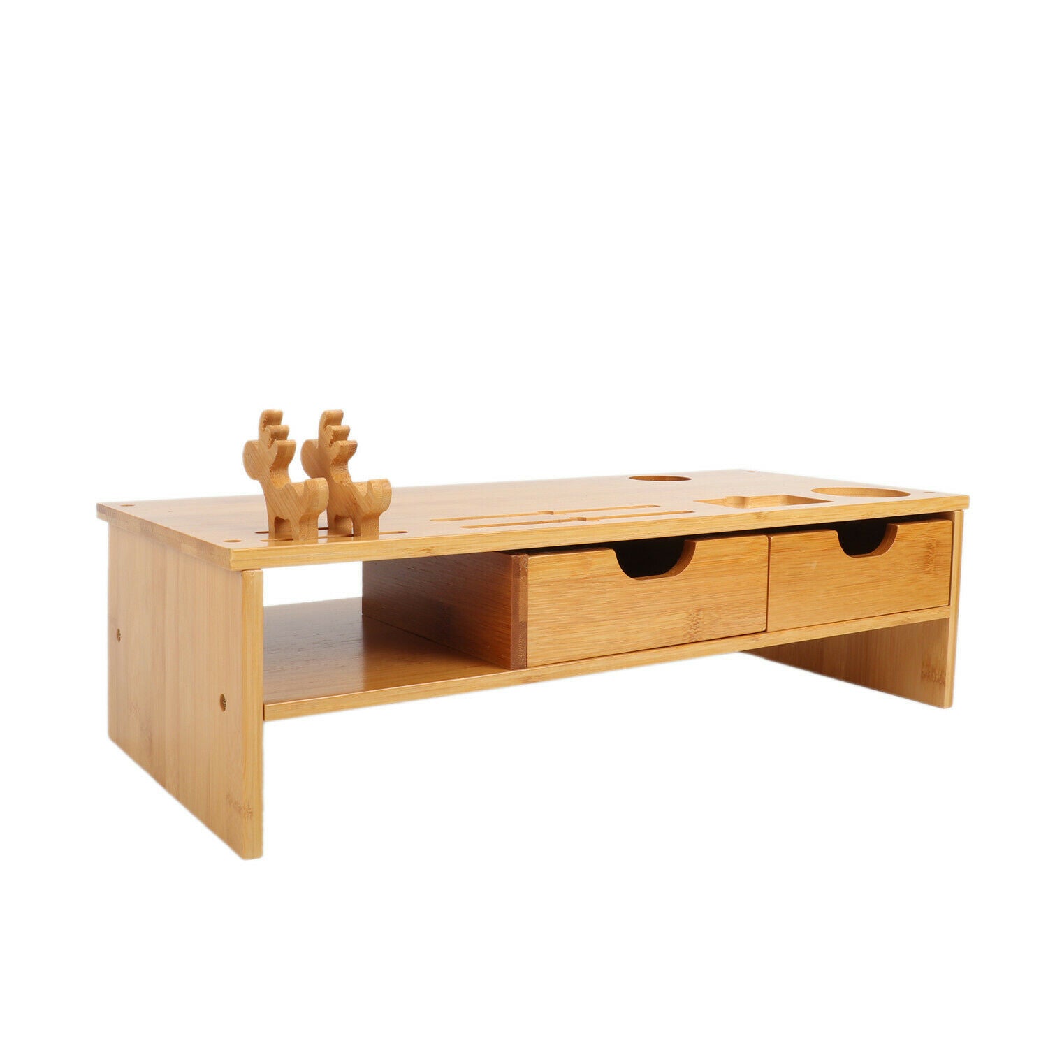 Bamboo PC Monitor Stand Laptop Computer Screen Desk Riser Rack w/Storage Drawers