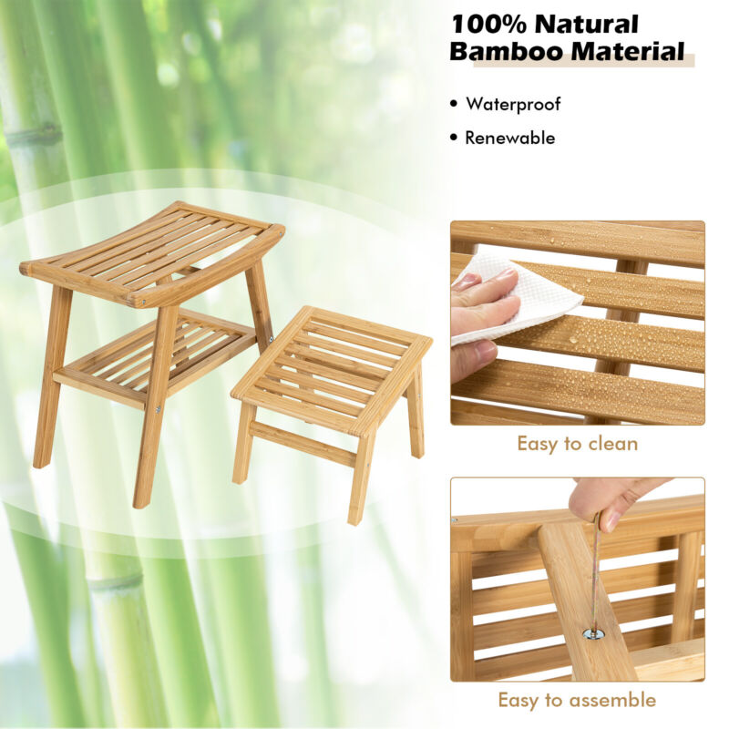 Bamboo Shower Bench Foot Stool Set Bathroom Organizer Seat Stool Shower Bench
