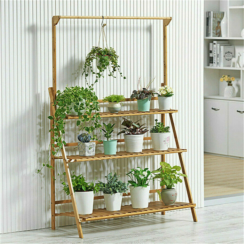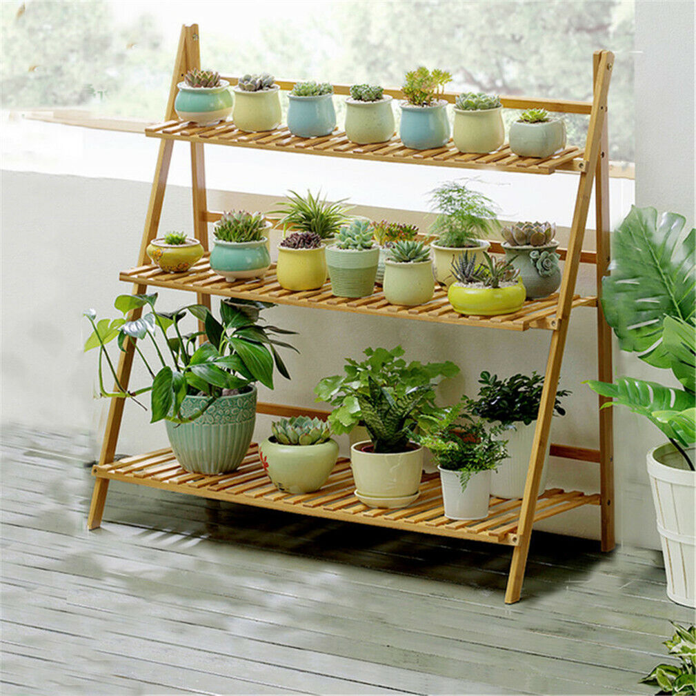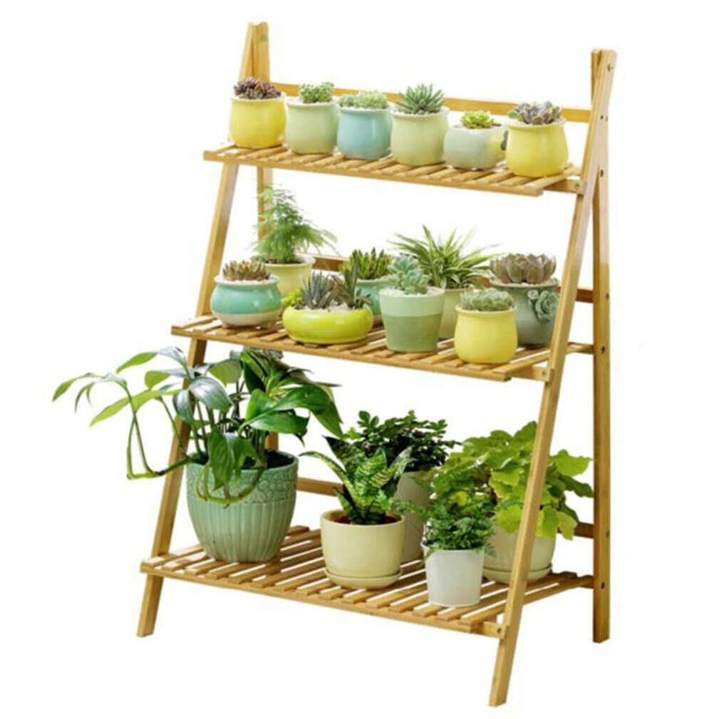 Bamboo Wooden Shelf Plant Stand Folding Multi Tier Ladder Storage Indoor Outdoor