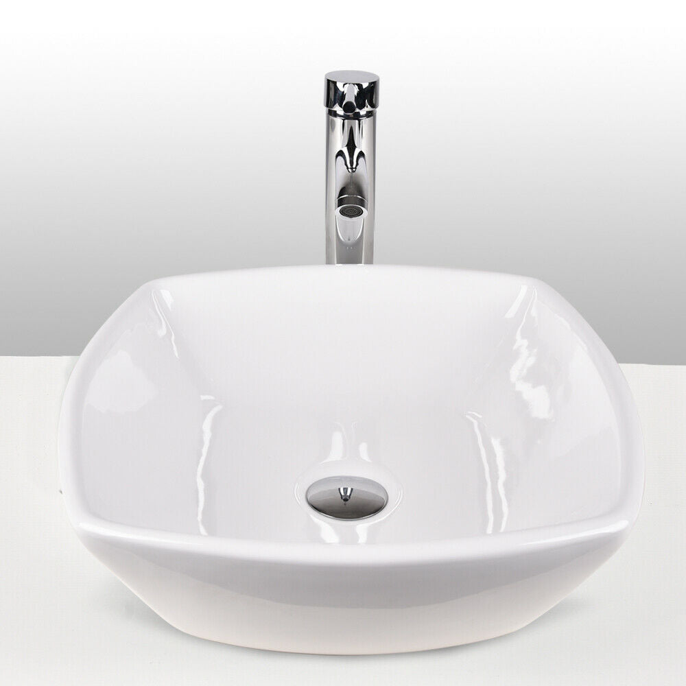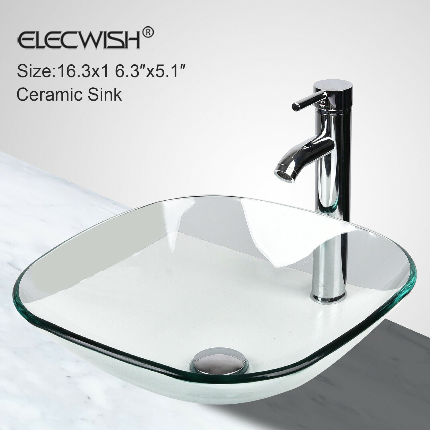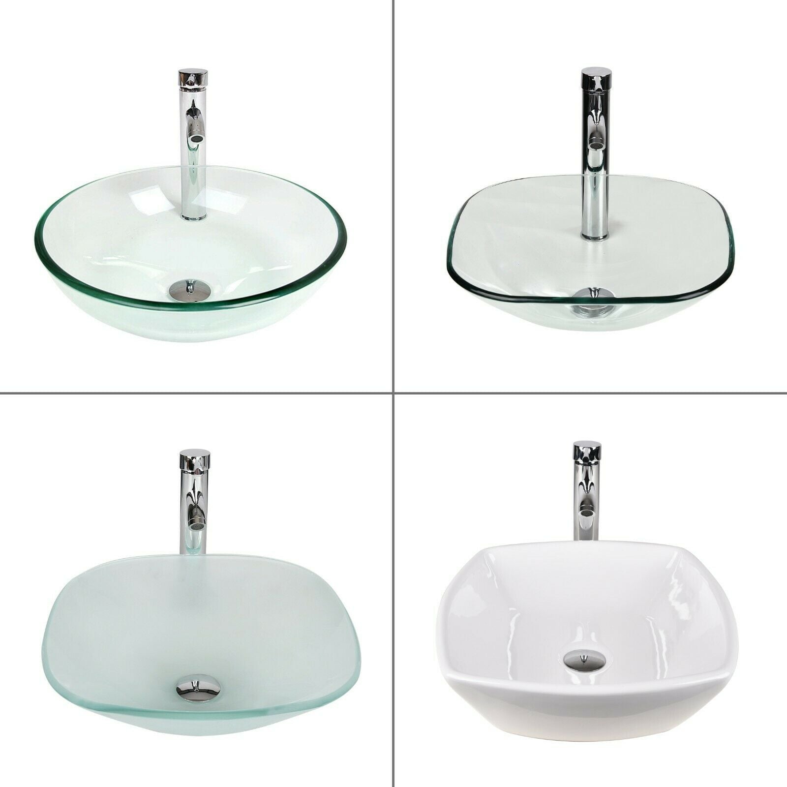 Bathroom Basin Sink Wash Bowl Vessel Countertop Faucet Taps Set Glass& Ceramic