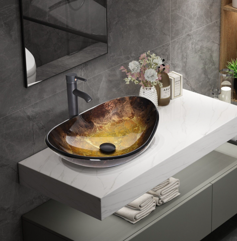 Bathroom Sink Basin Countertop Wash Bowl Cloakroom Tempered Glass Tap Waste Set