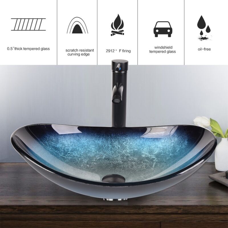 Bathroom Sink Bowl Wash Basin Countertop Cloakroom Tempered Glass Tap Waste Set