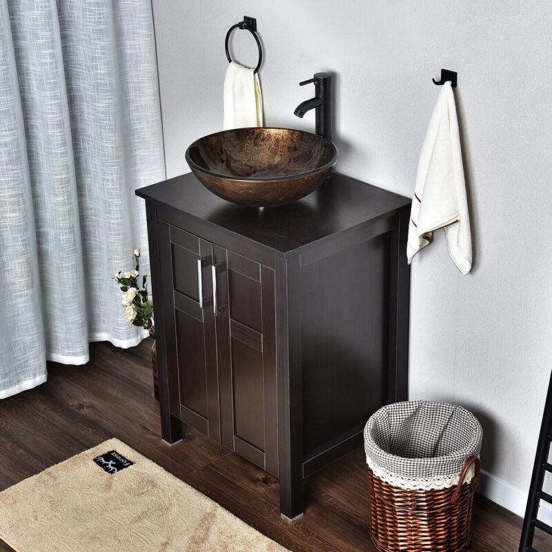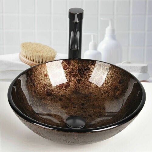 Bathroom Sink Bowl Wash Basin Countertop Tempered Glass Tap Waste Set Round
