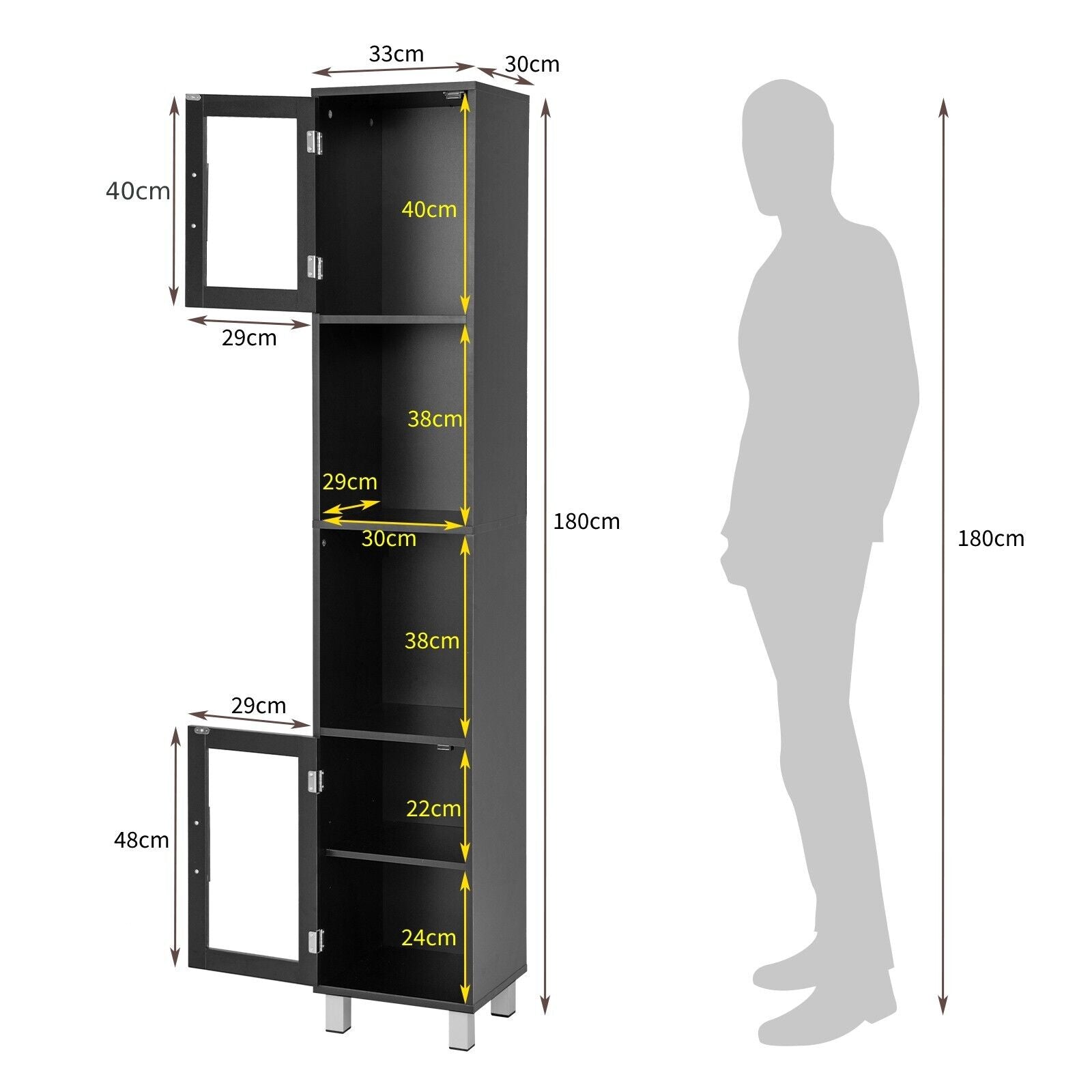Bathroom Tall Cabinet Slim Freestanding Storage Organizer Cupboard 2 Glass Doors