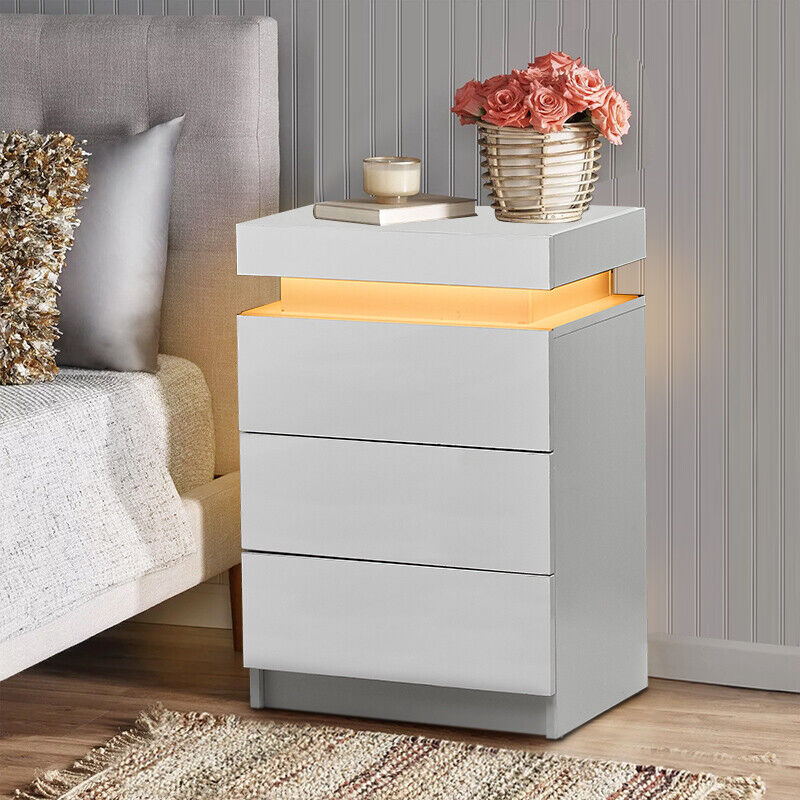 Bedside Table Cabinet LED Side End Table LED White High Gloss Living Room