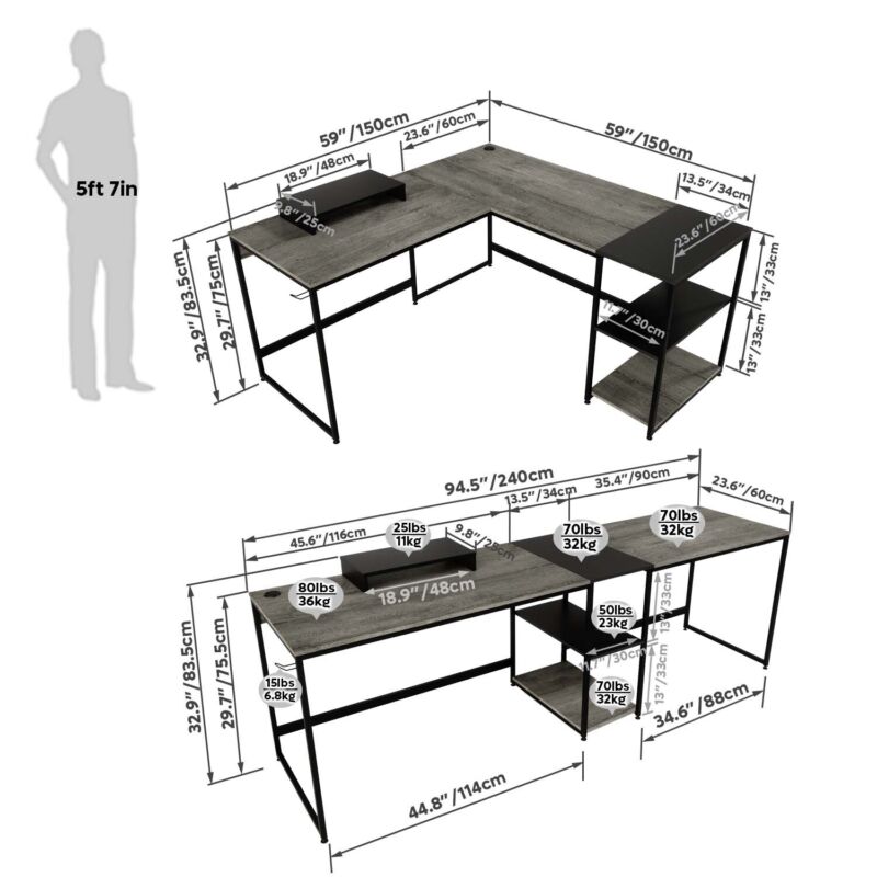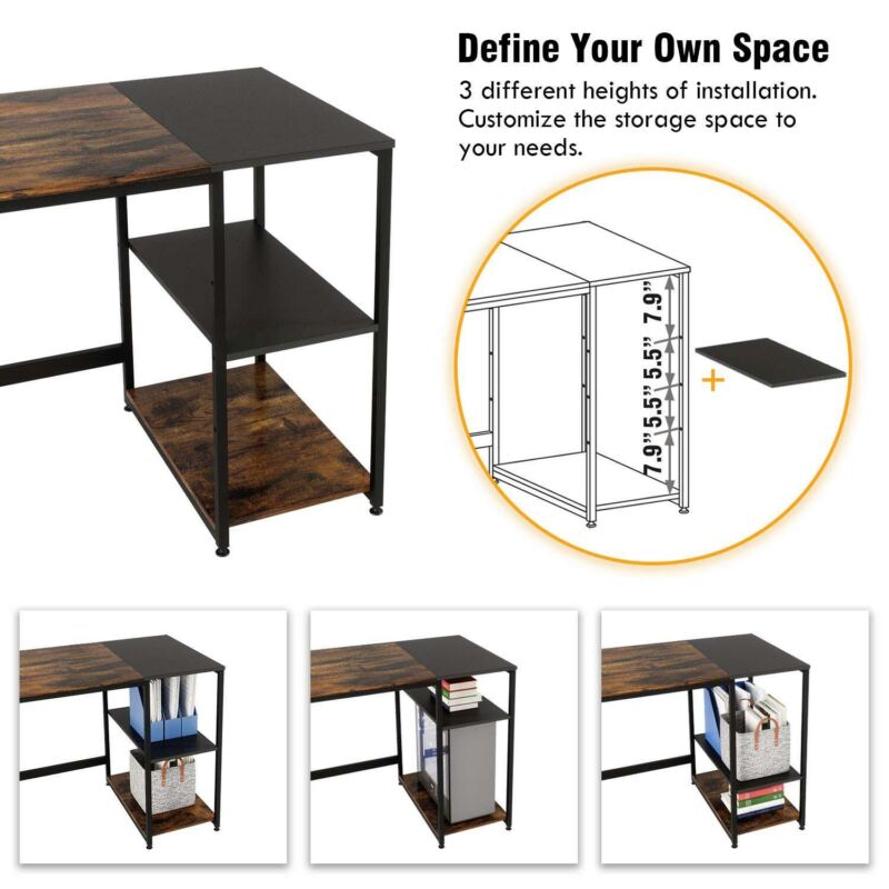 Revisible L Shaped Desk w/ Storage Shelves, 2 Person Workstation Table