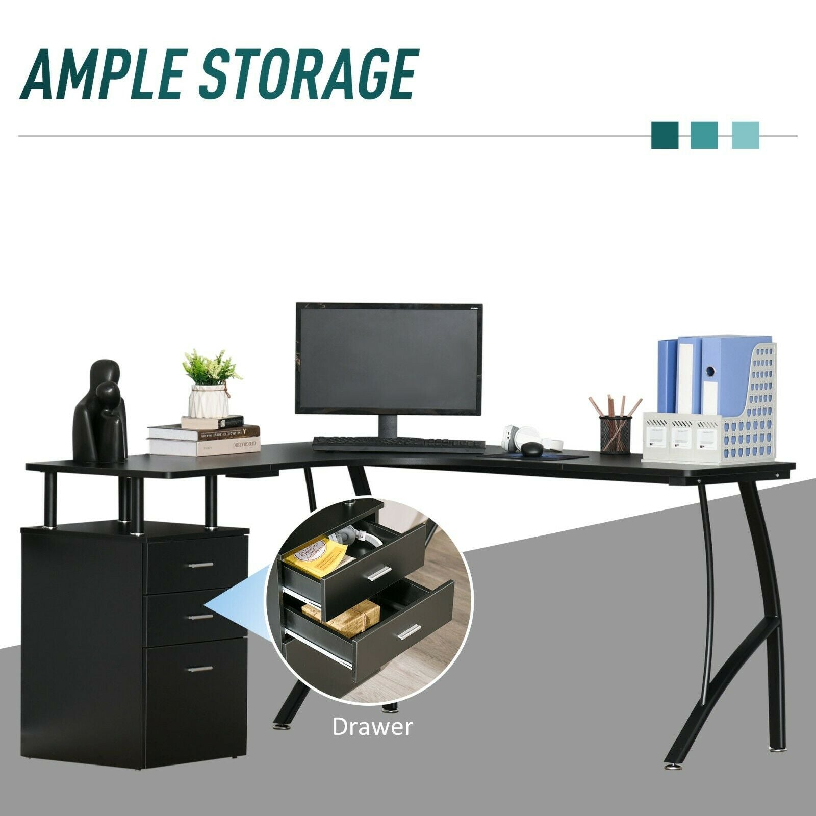 Black Corner Desk with Storage Cabinet Drawer Home Office L Shape Computer Table