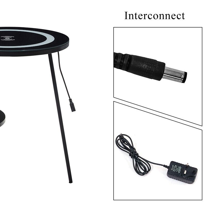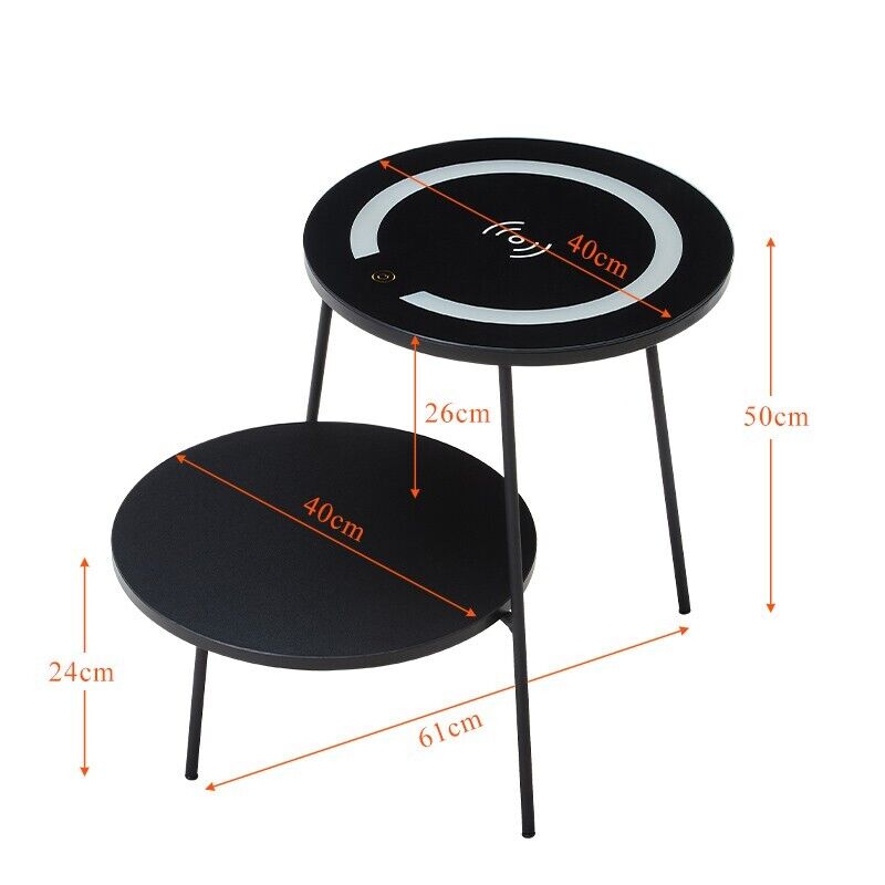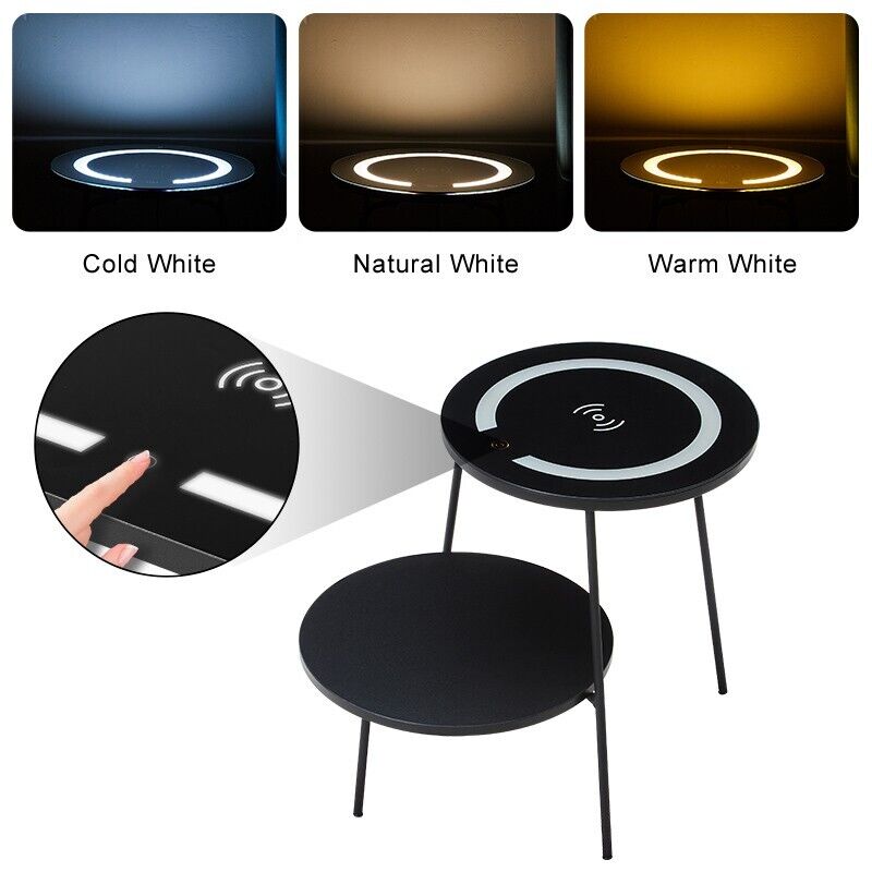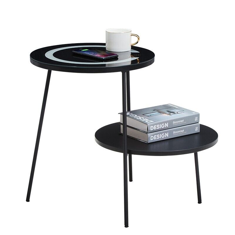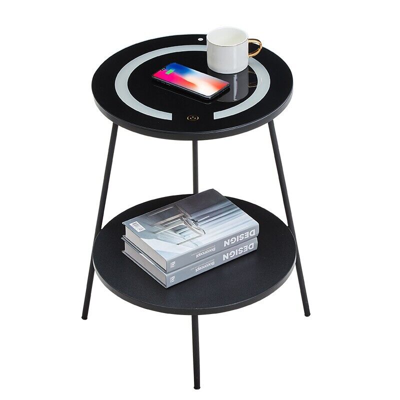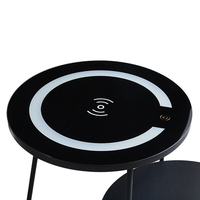 Black Glass Side End table Beside Table Round With LED Wireless Charging
