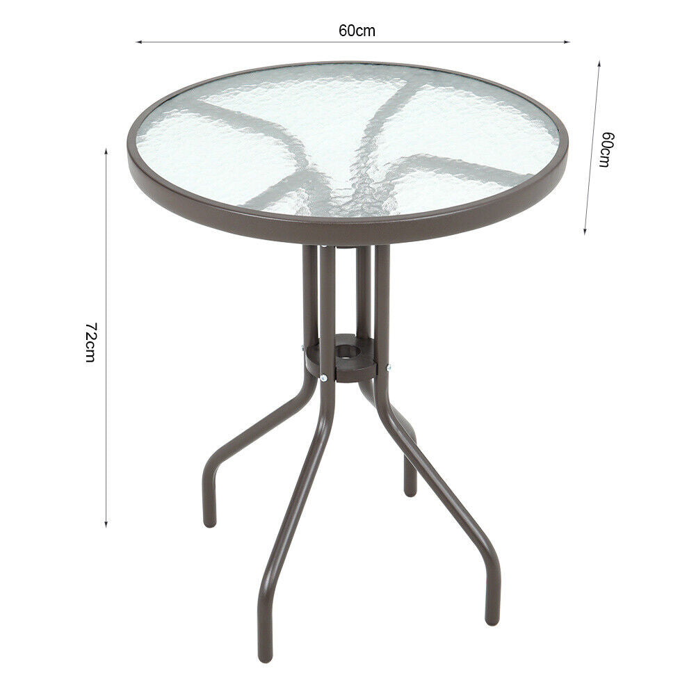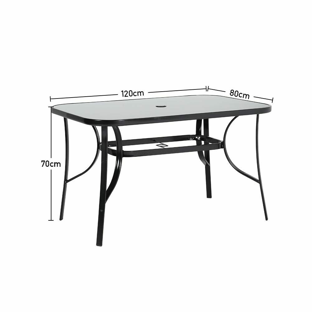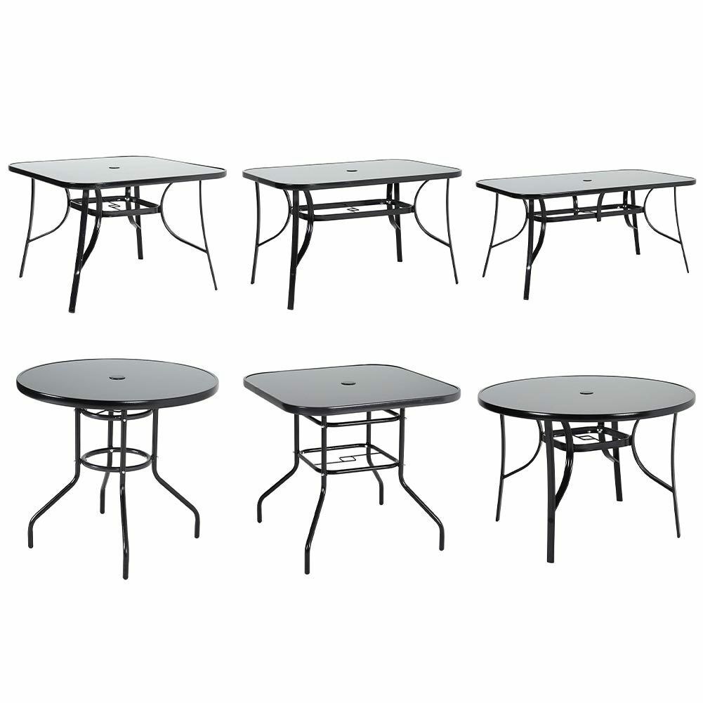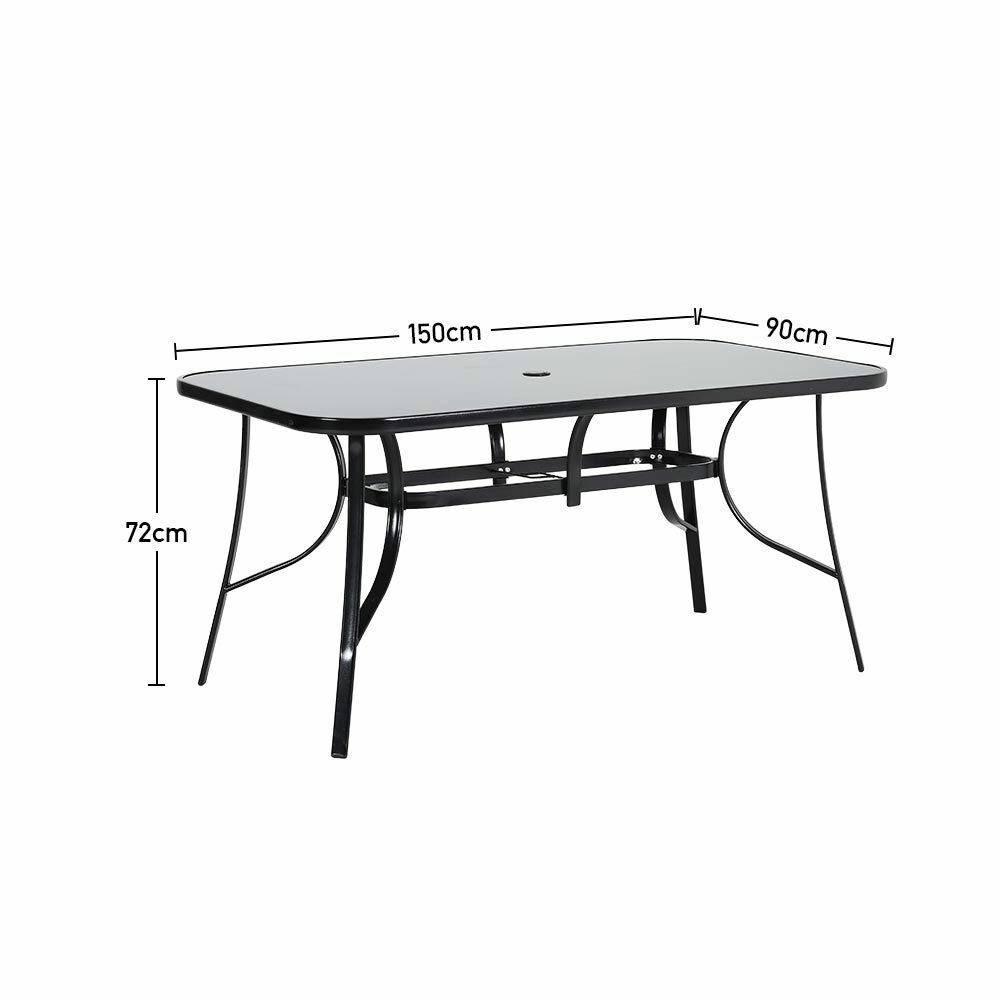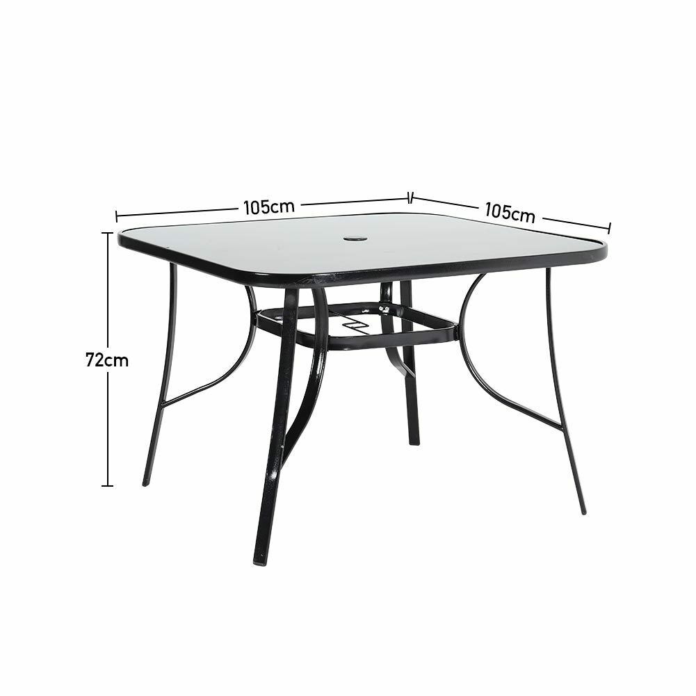 Features Flat Pack, Umbrella Hole, Black Metal Frame, Black Glass Top Table