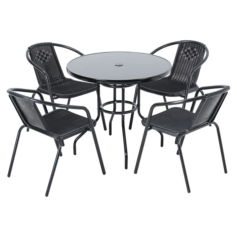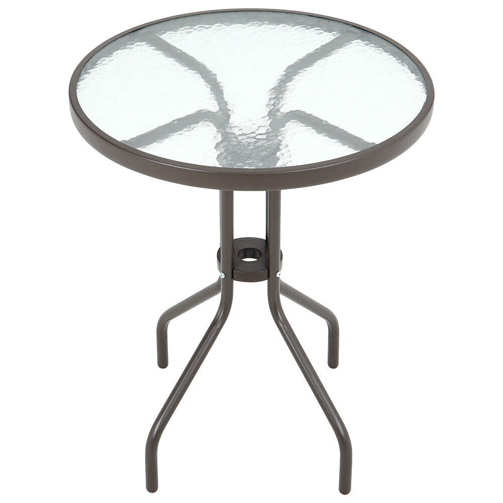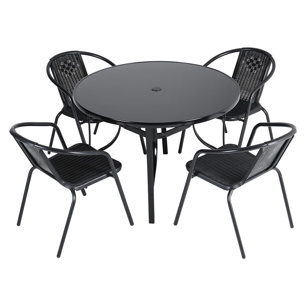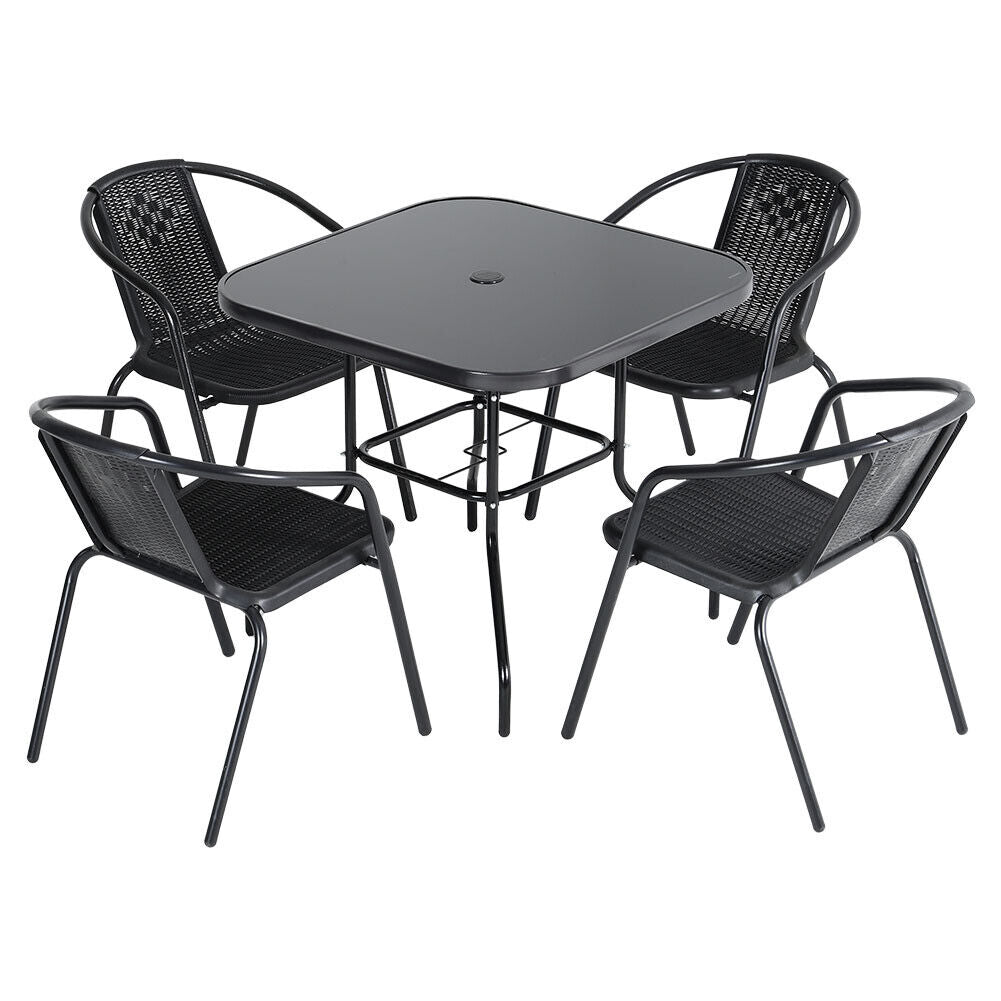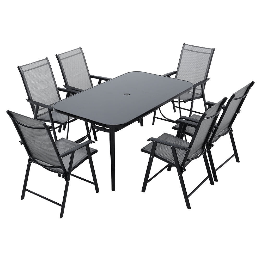 Features Flat Pack, Umbrella Hole, Black Metal Frame, Black Glass Top Table