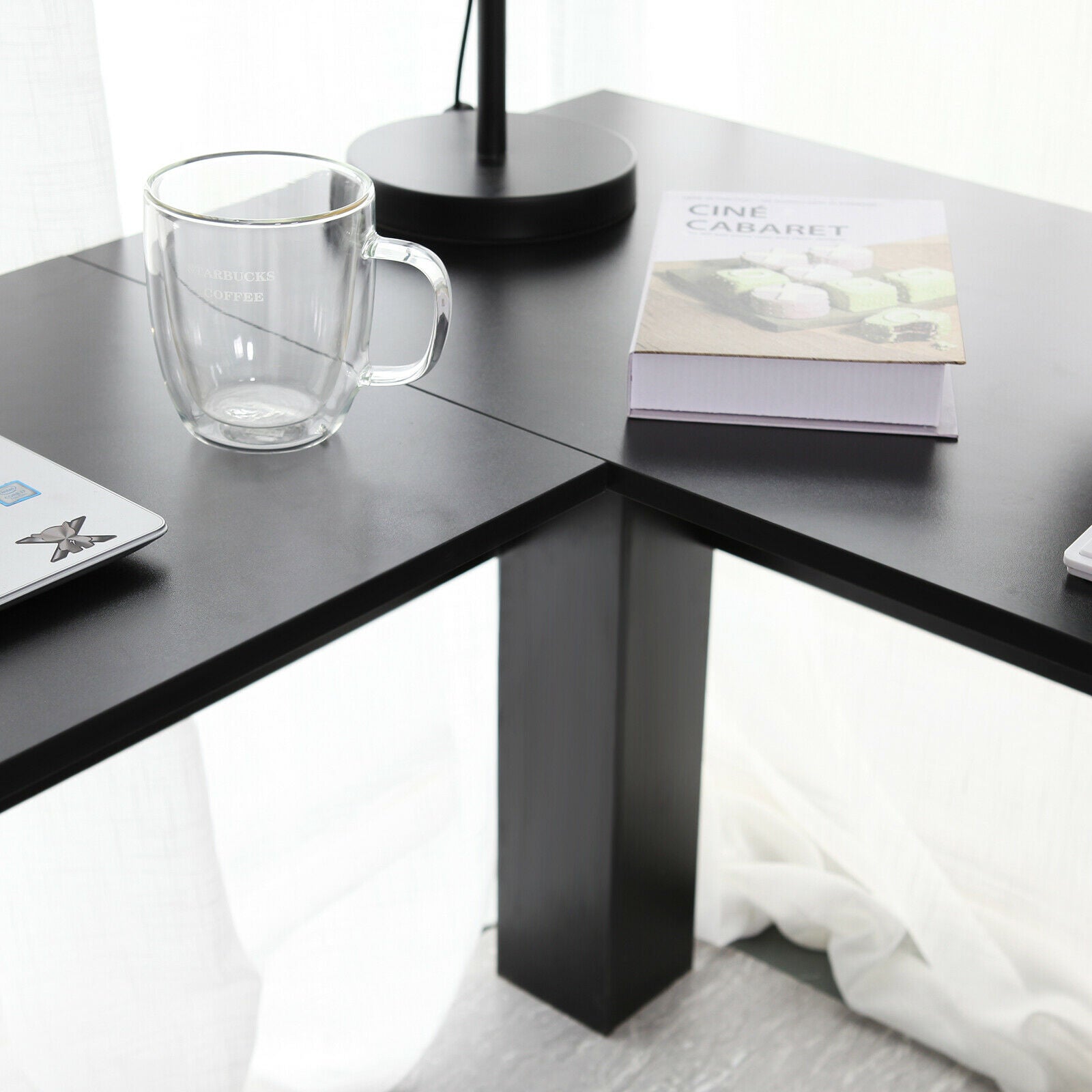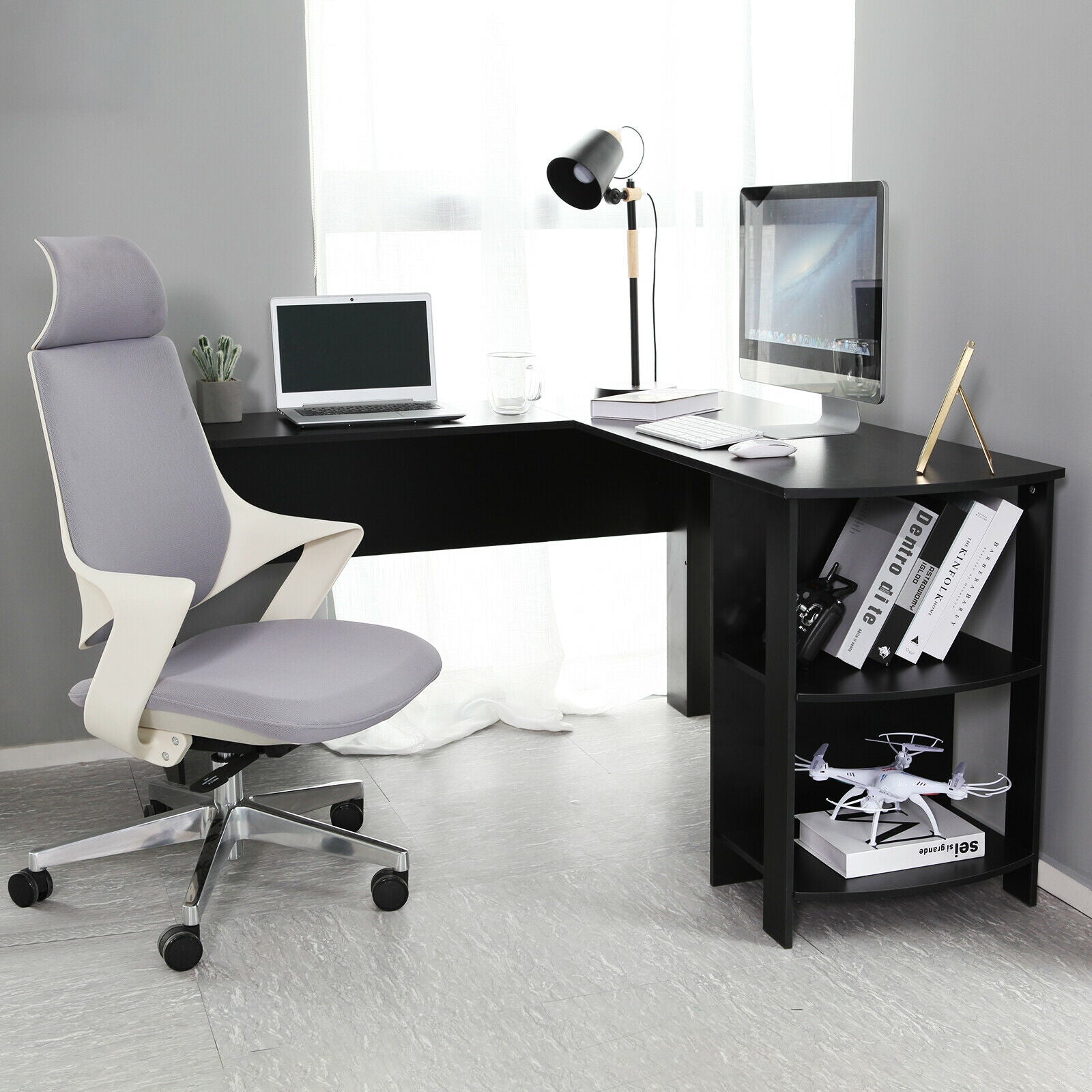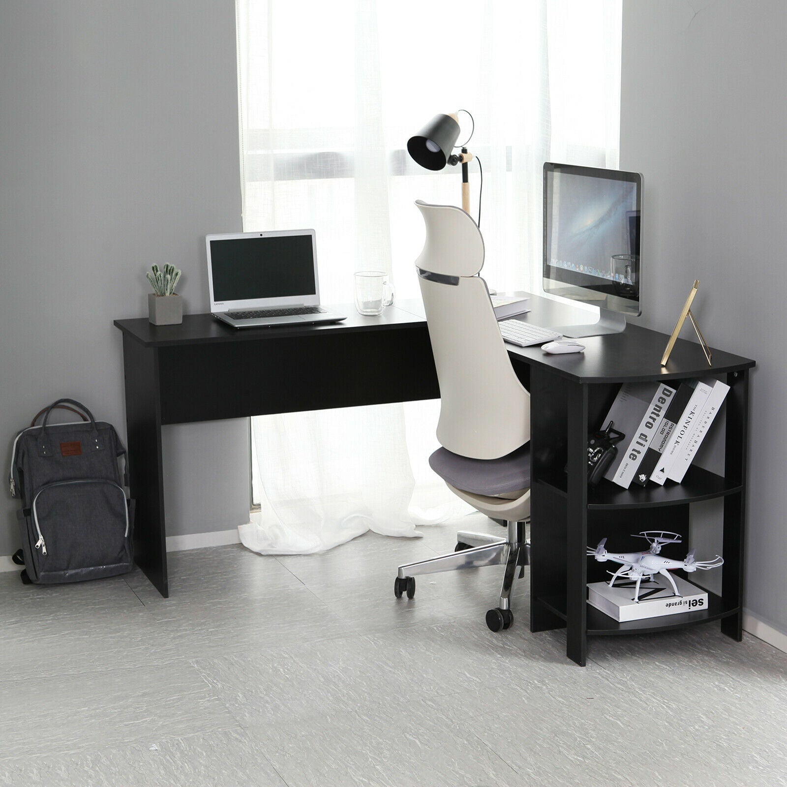 - L-shaped Design: This desk is remarkable for its L-shaped design that fits perfectly on the corner of any room. It's available in a choice of two most easy matching colors:Plain White and Classic Black, such a versatile office-furniture that can always satisfy you.