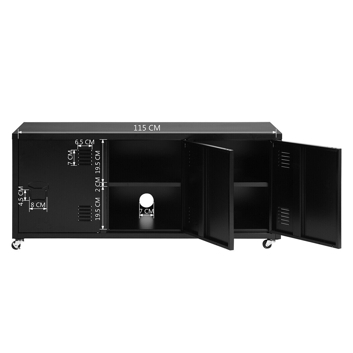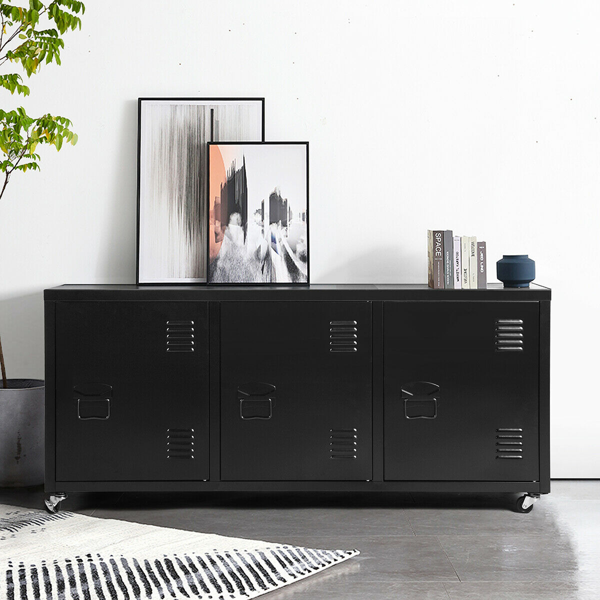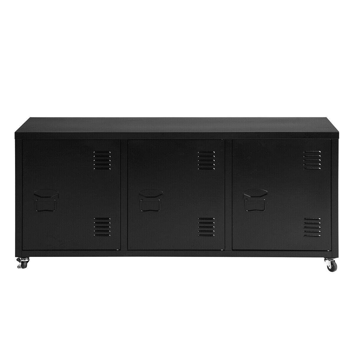 Black Sideboard 3 Door Cupboard Modern Metal Storage Cabinet TV Stand ww/ Wheels