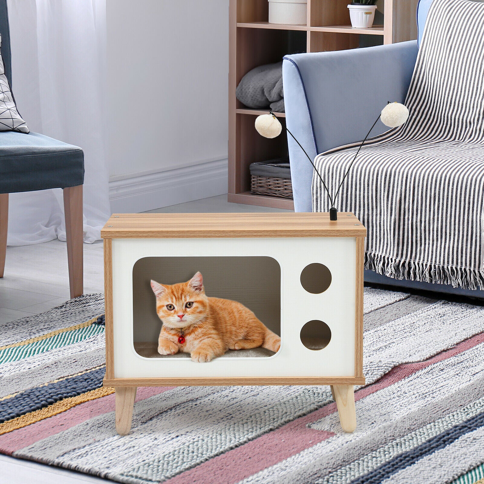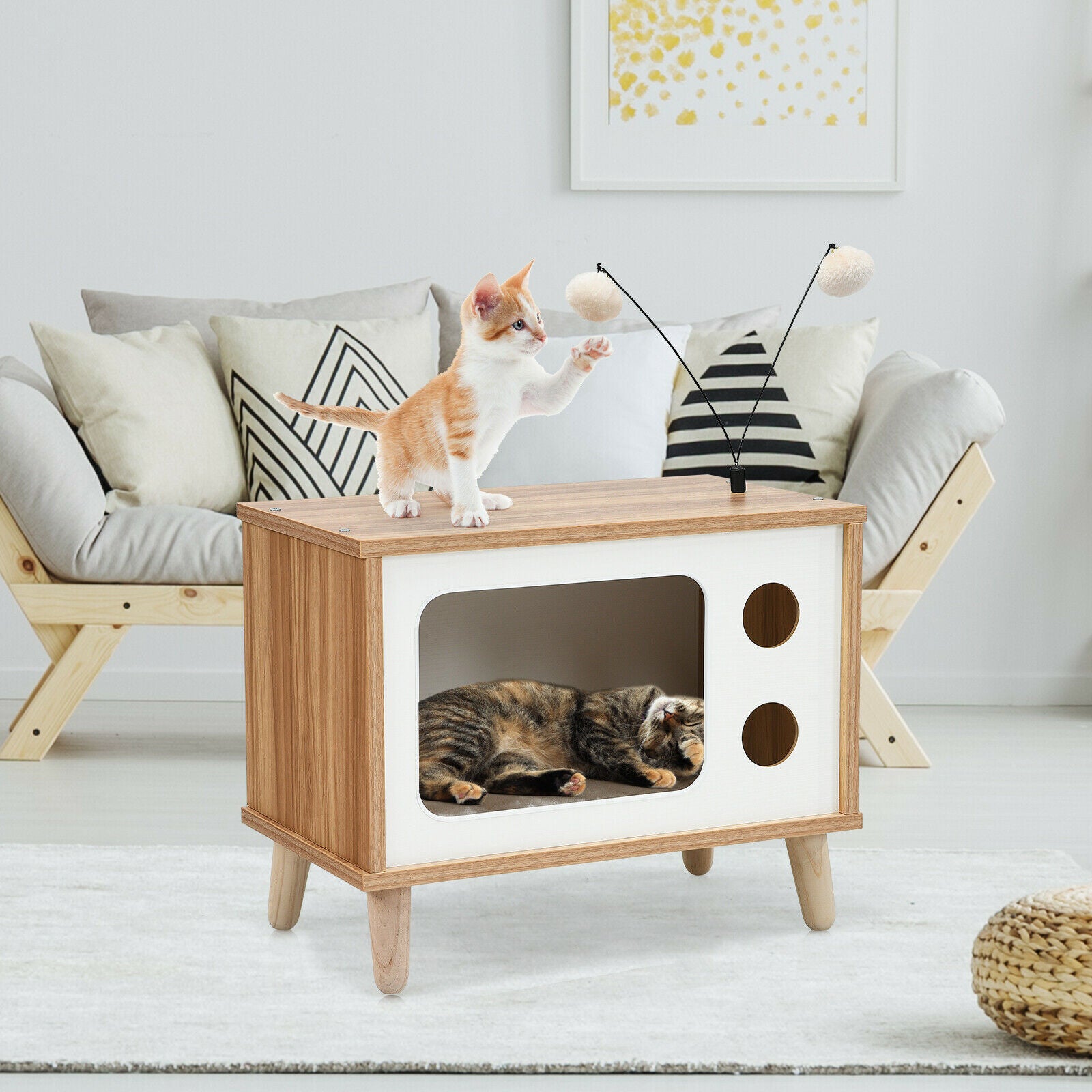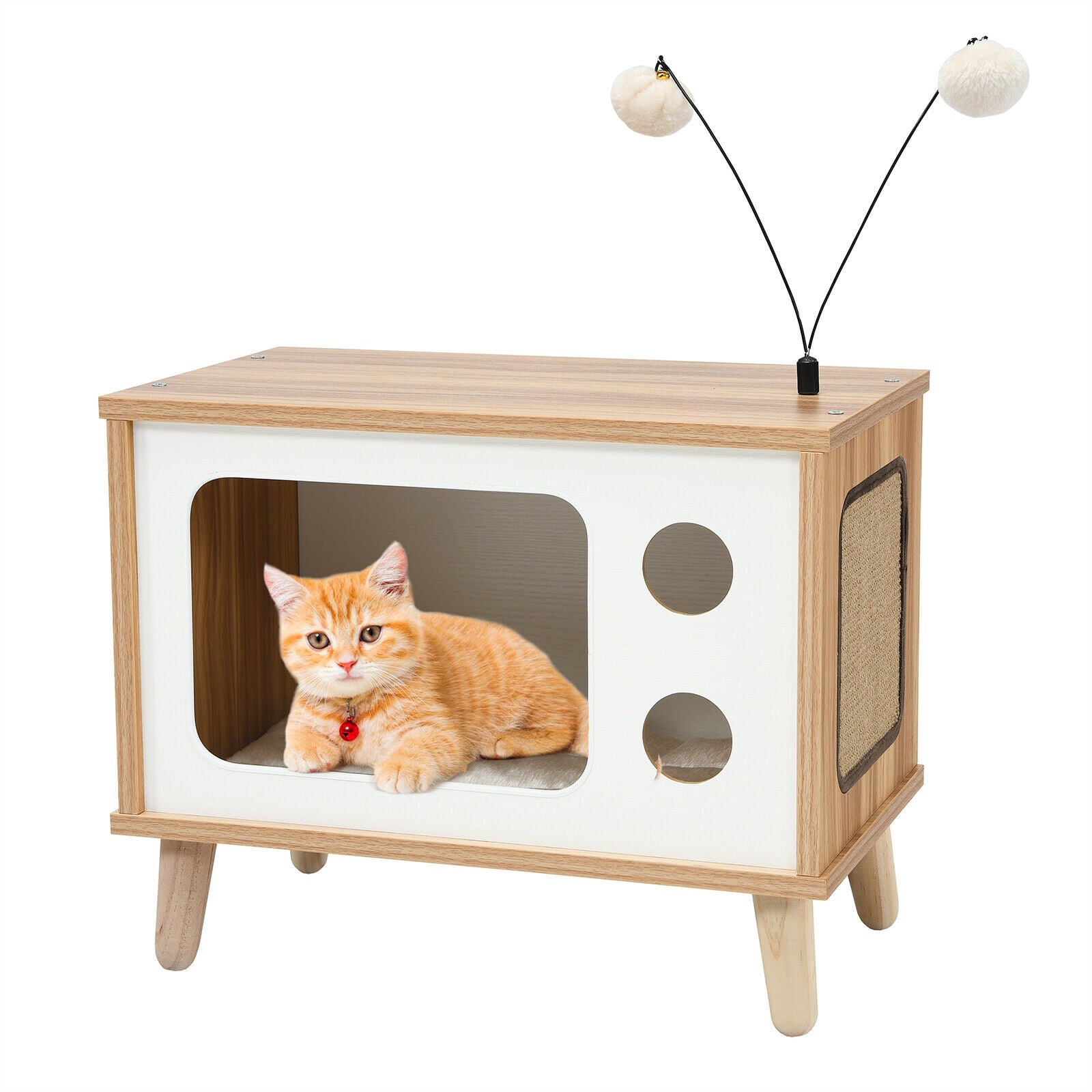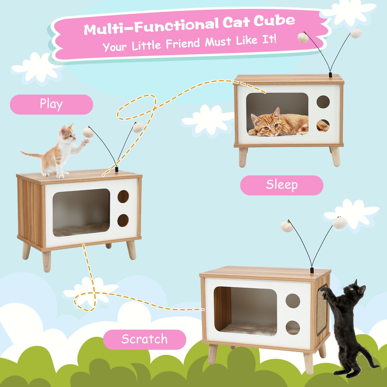 Cat Cave Bed House Indoor Wooden Cat Cabinet Condo W/ Balls & Scratching Board