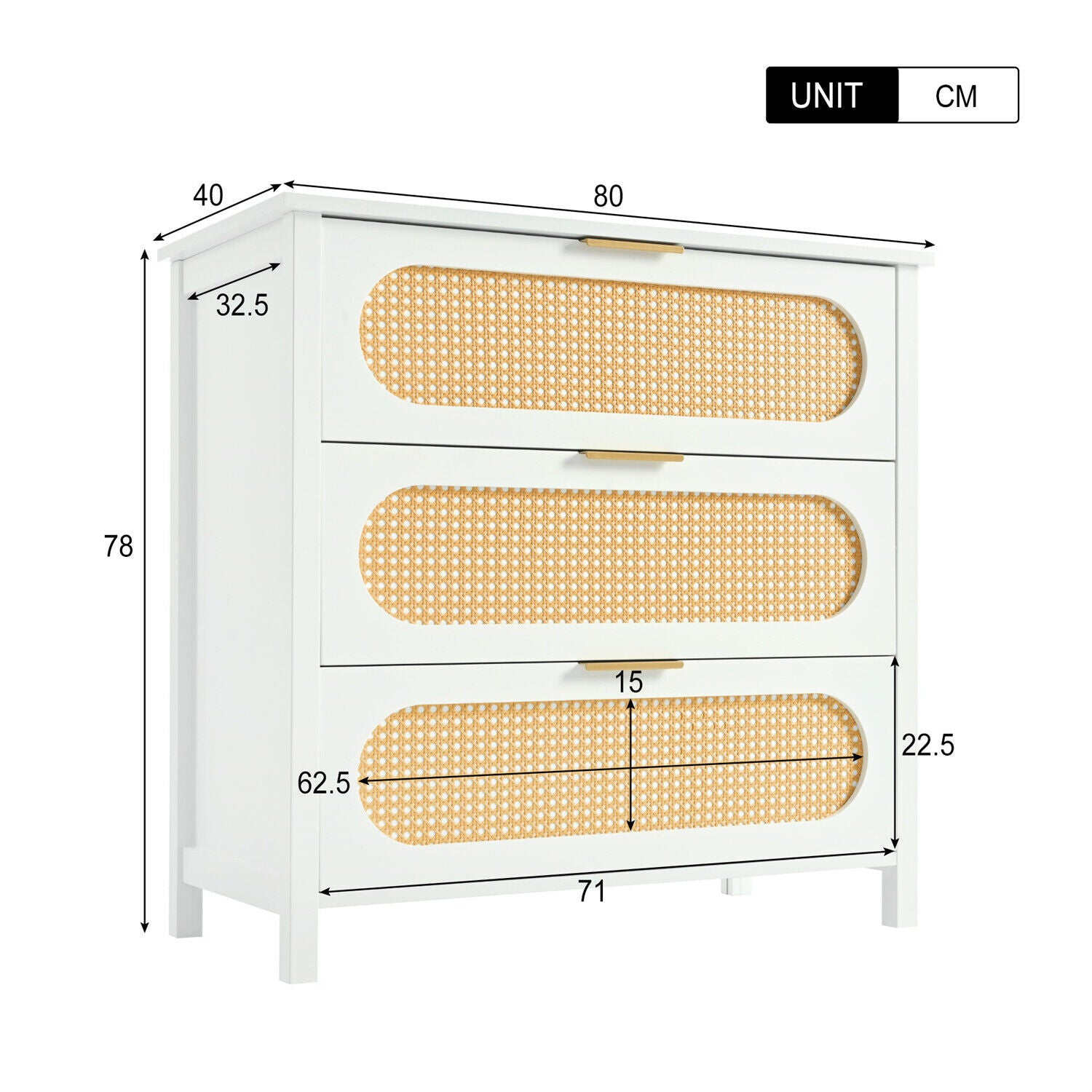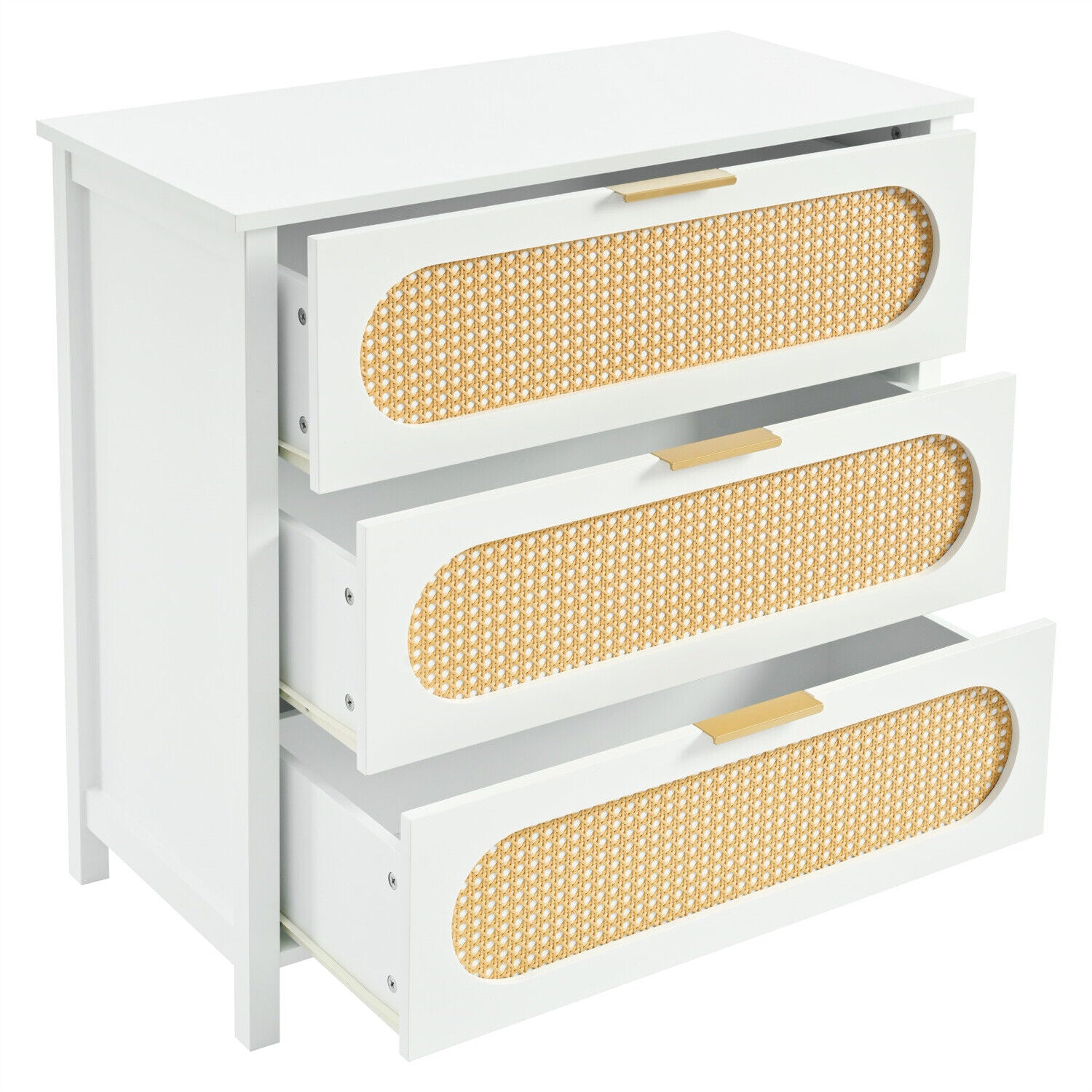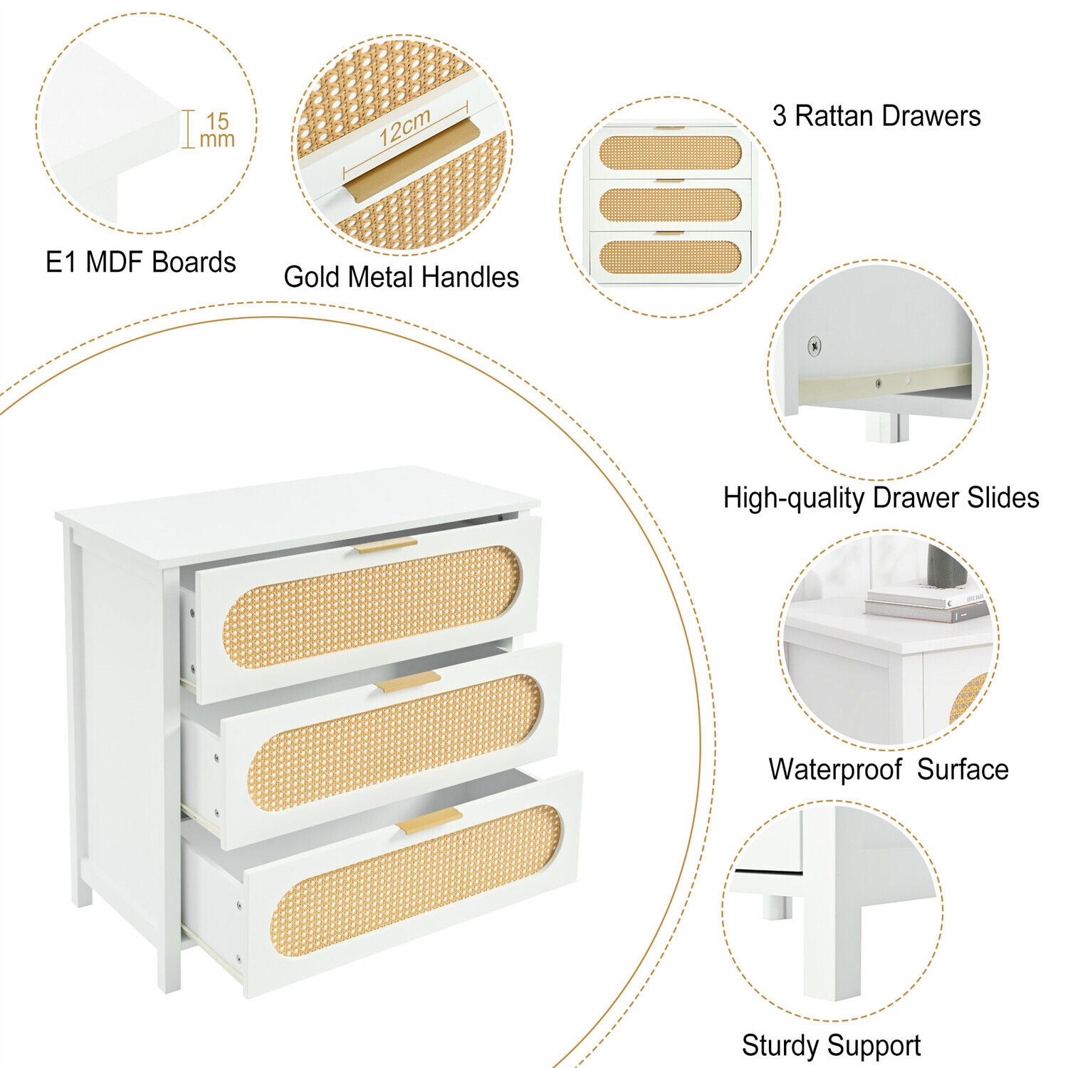 Chest of Drawers 3 Rattan Drawers White Storage Cabinet Home Bedroom Furniture