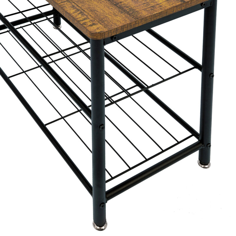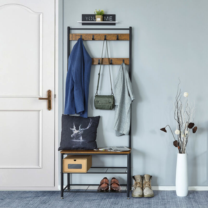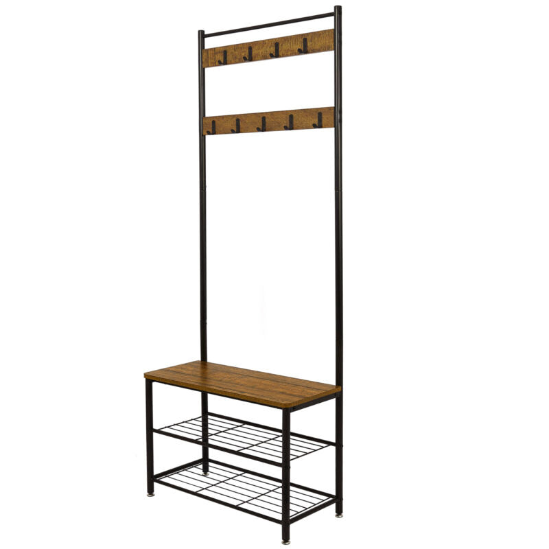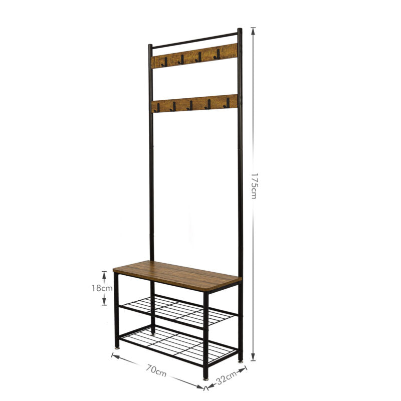 Coat Rack Stand Shoe Storage Bench with 9 Hooks Metal Frame Hallway Retro