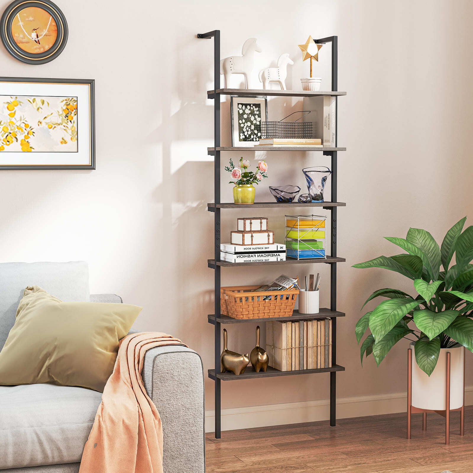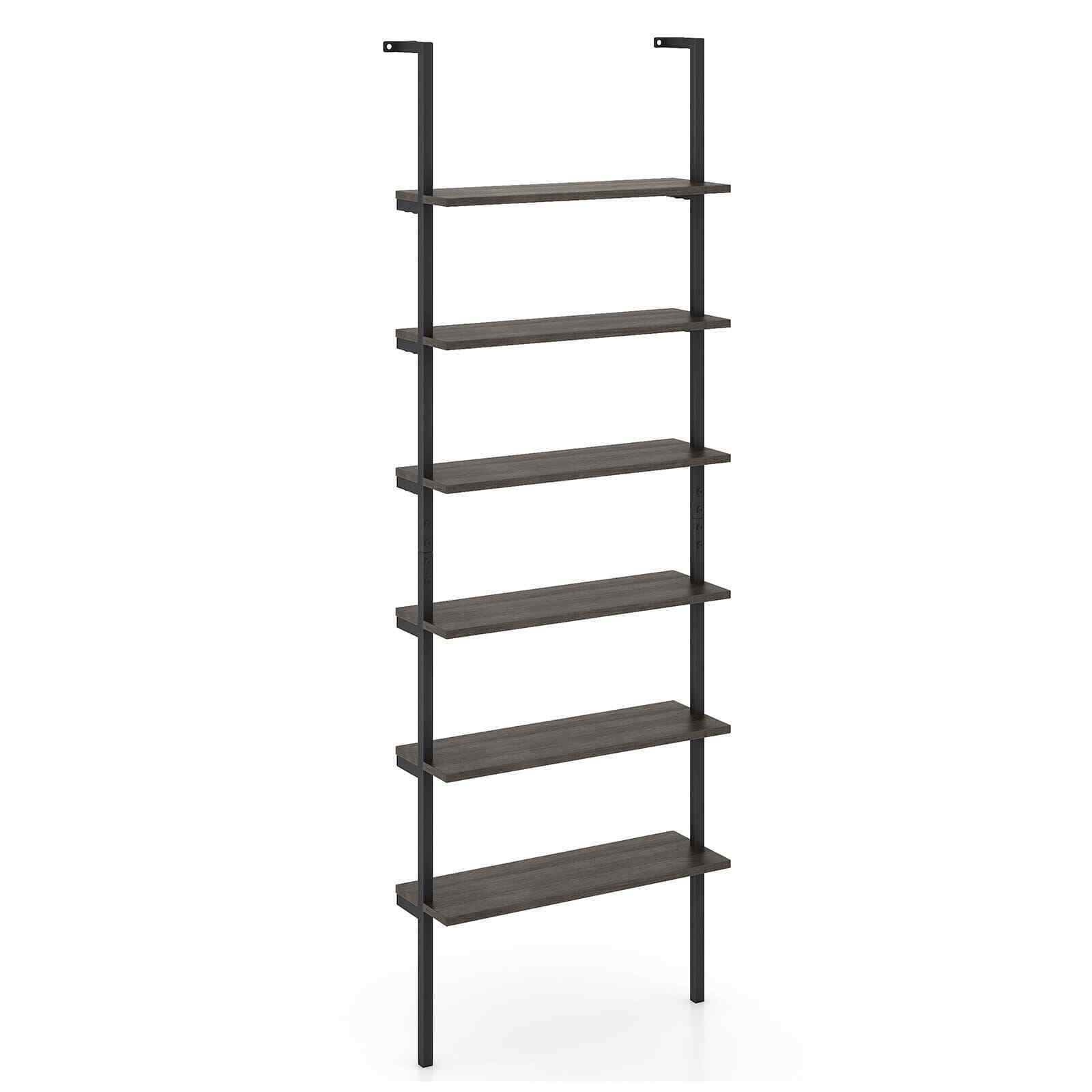 6-Tier Ladder Shelf Wall Mounted Bookshelf with Metal Frame-Oak