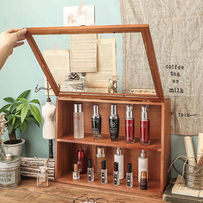 Desktop Makeup Storage Display Cabinet 2 Tier Wooden Shelf Box with Clear Door