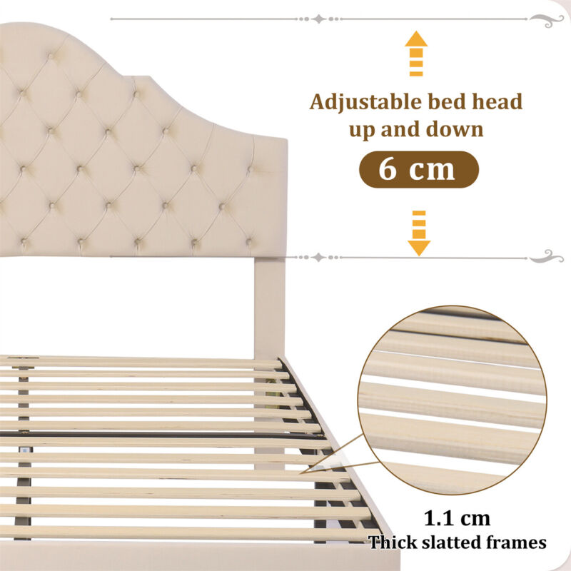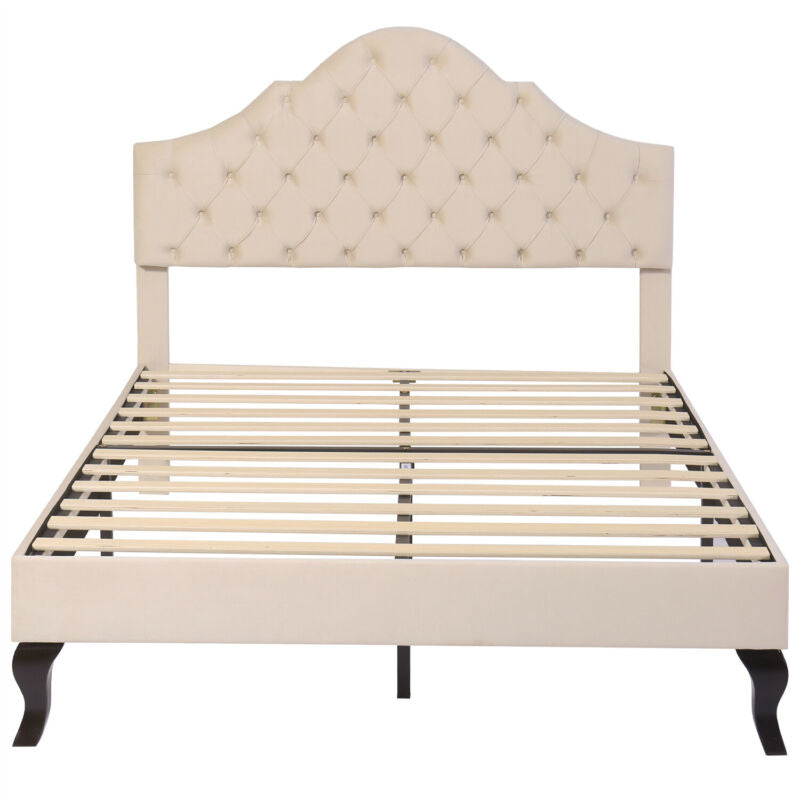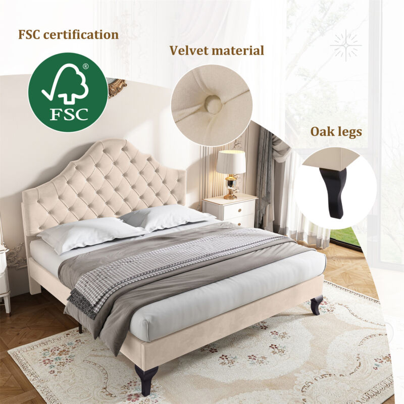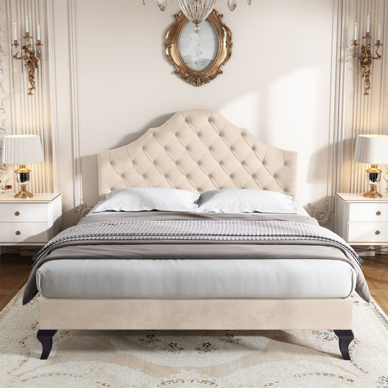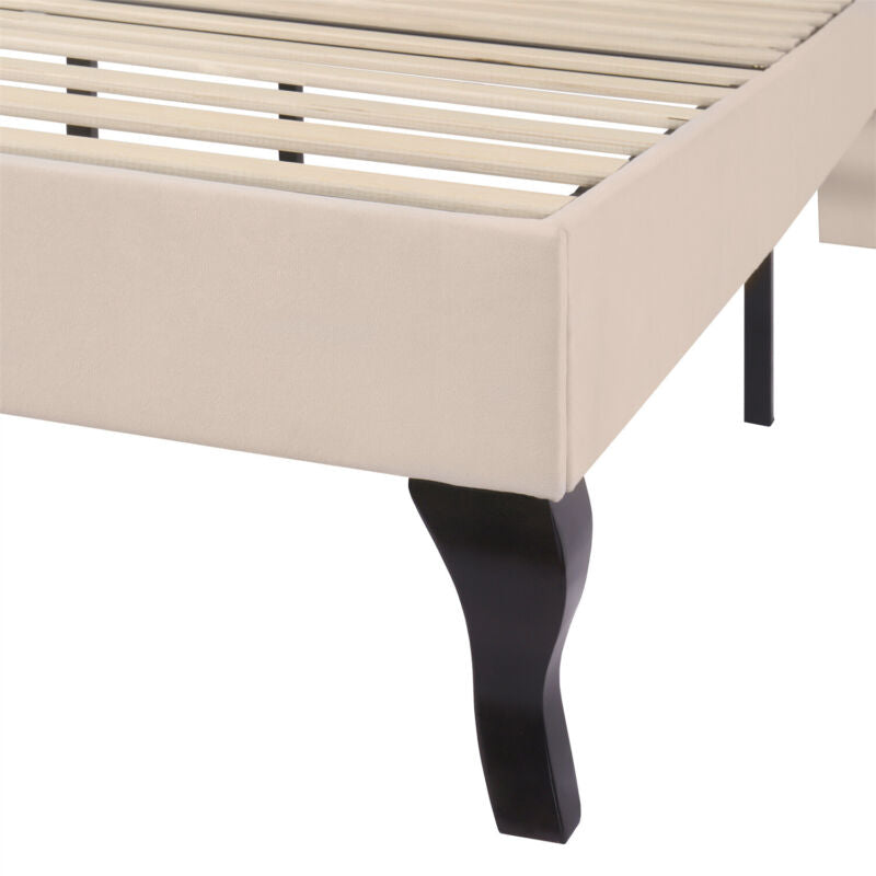 Double Size Bed 4ft6 Velvet Upholstered Slatted Bed Frame with Headboard Beige