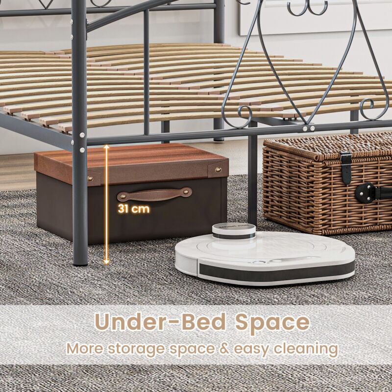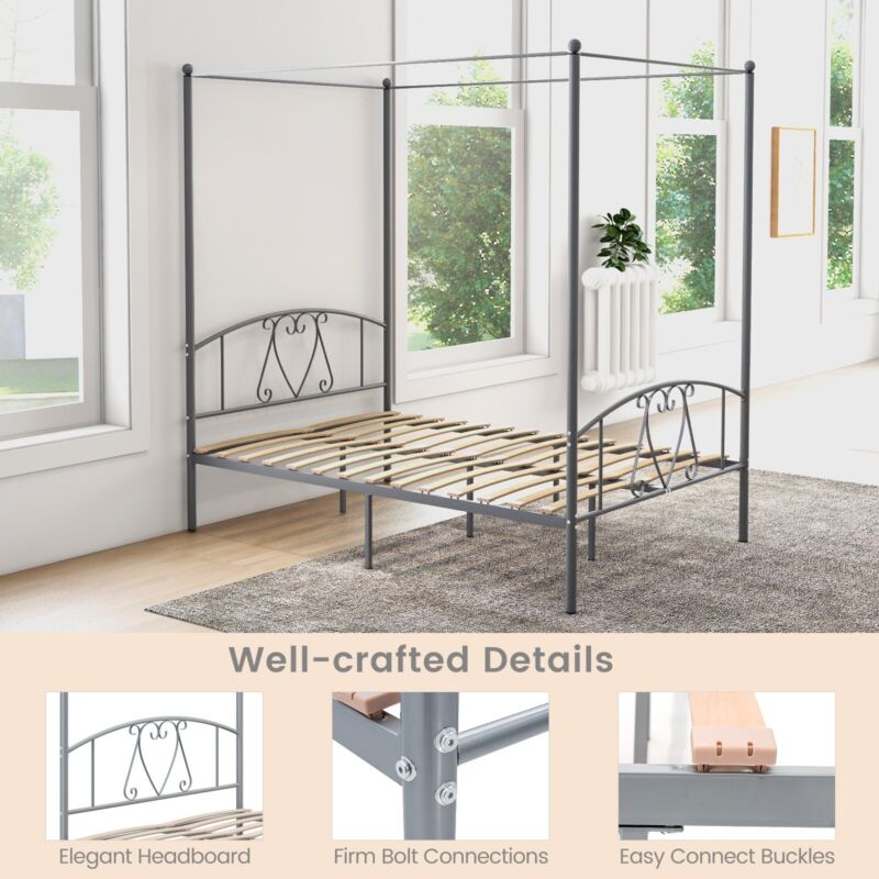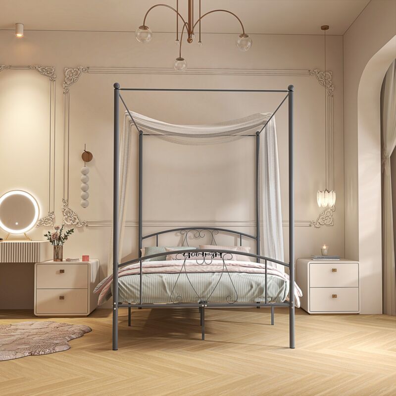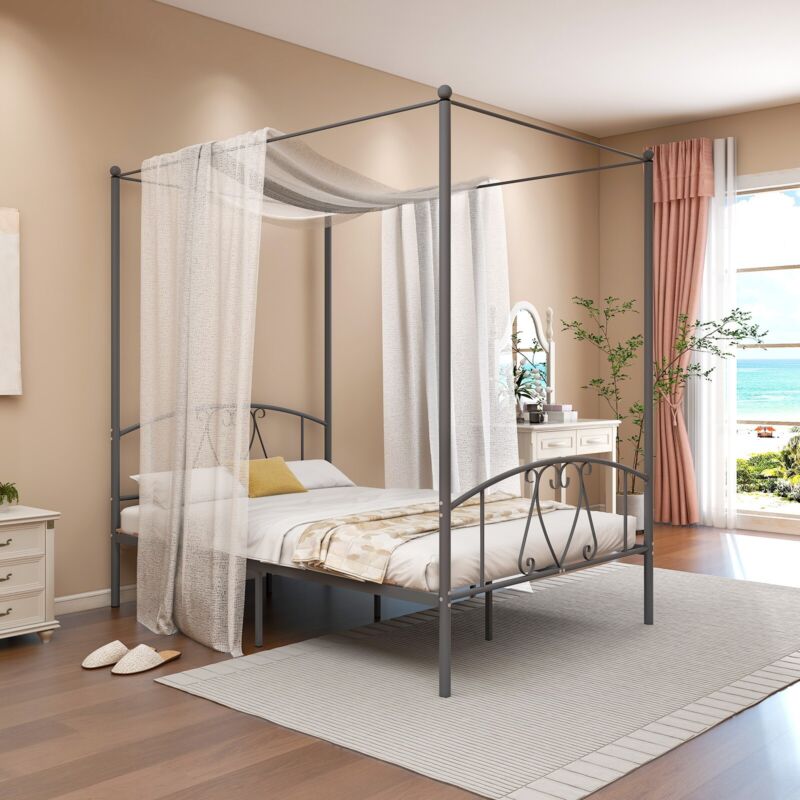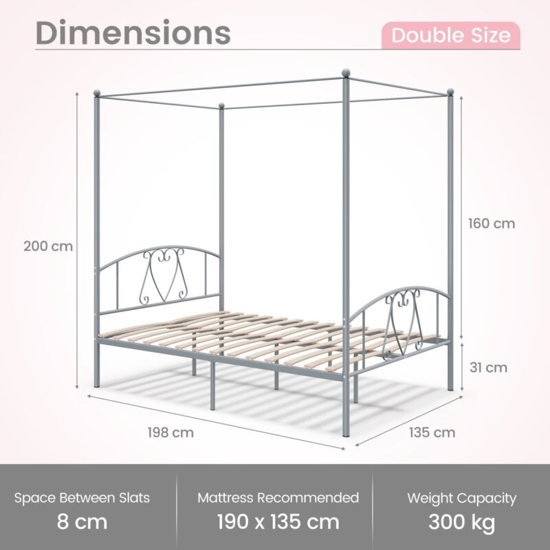 Double Size Metal Canopy Bed Frame 4-Poster Modern Platform Wooden Slat Support