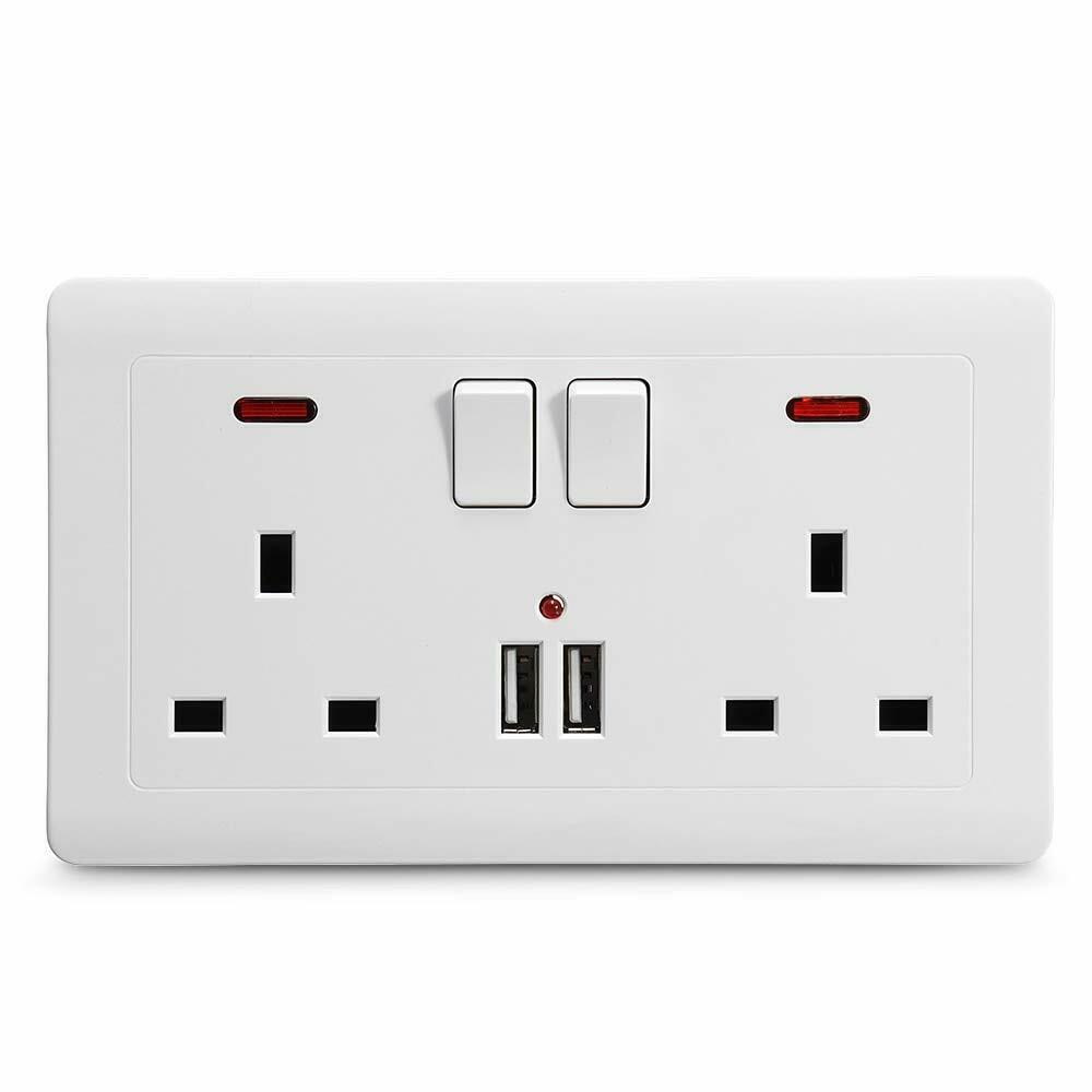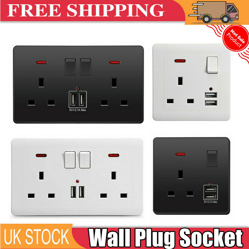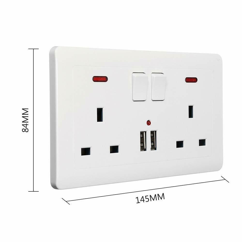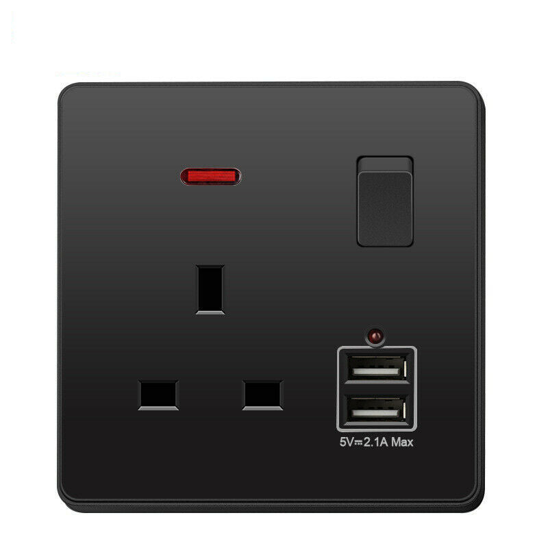 Double Wall Plug Socket 2 Gang 13A w/ USB Charger Port Outlets Black/White Plate