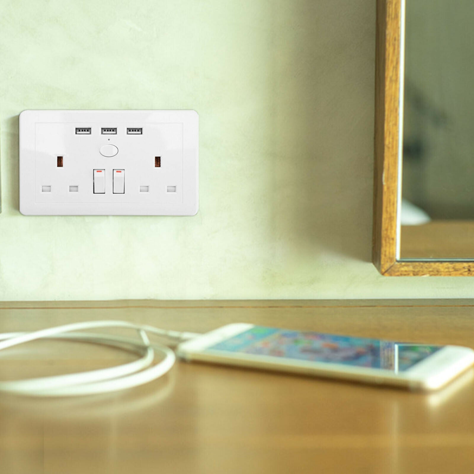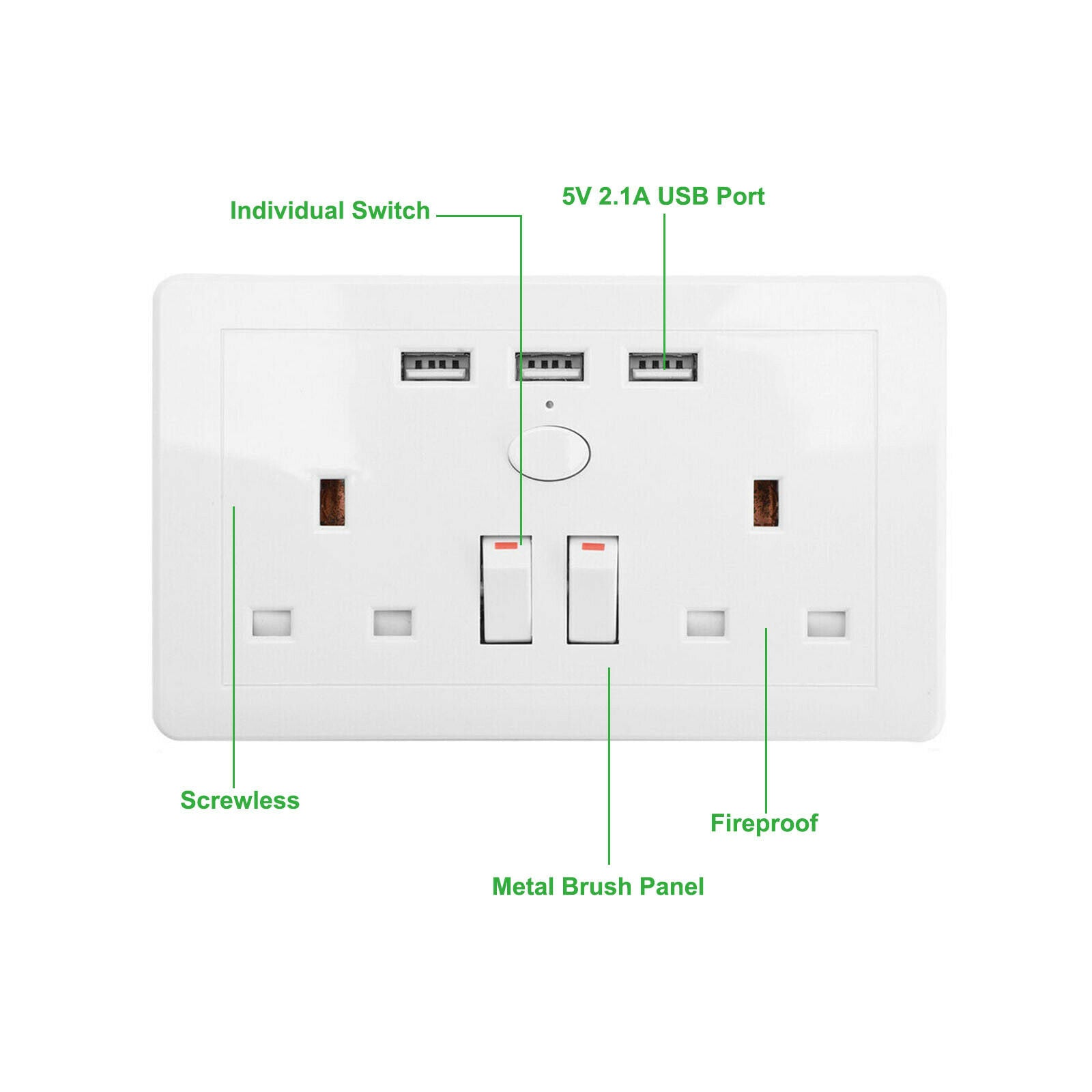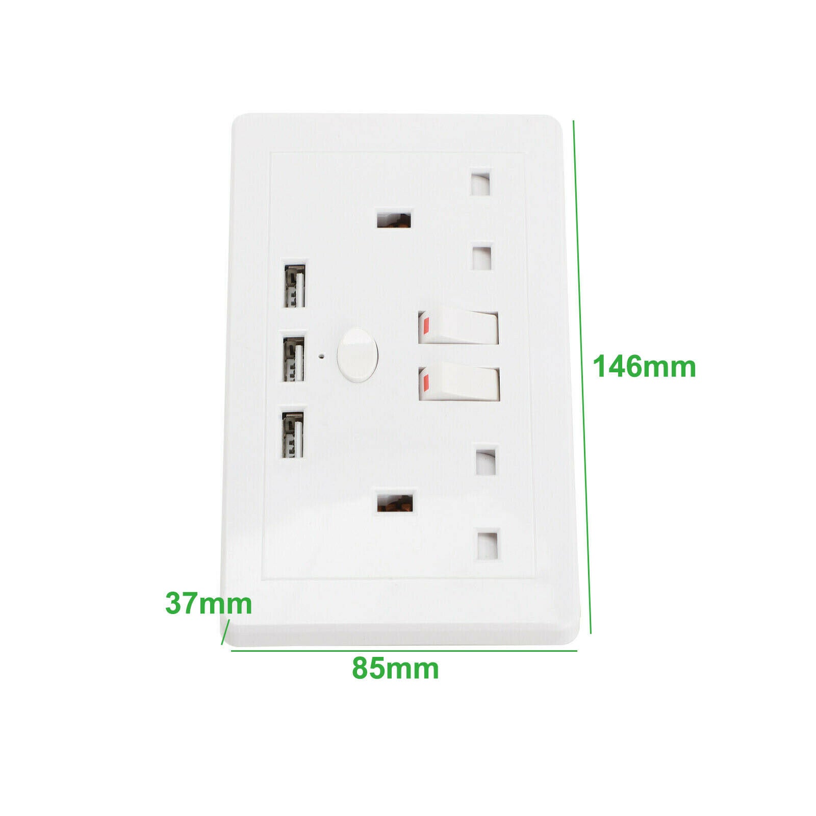 Double Wall UK Plug Socket 2 Gang 13A + 3 USB Charger Port Outlets Plate UK