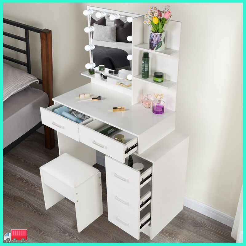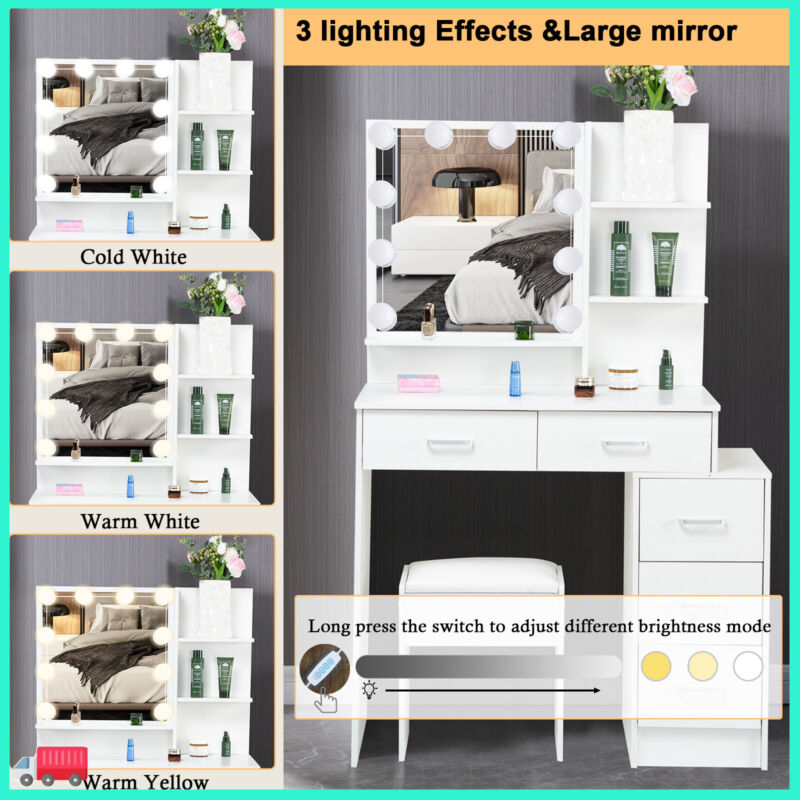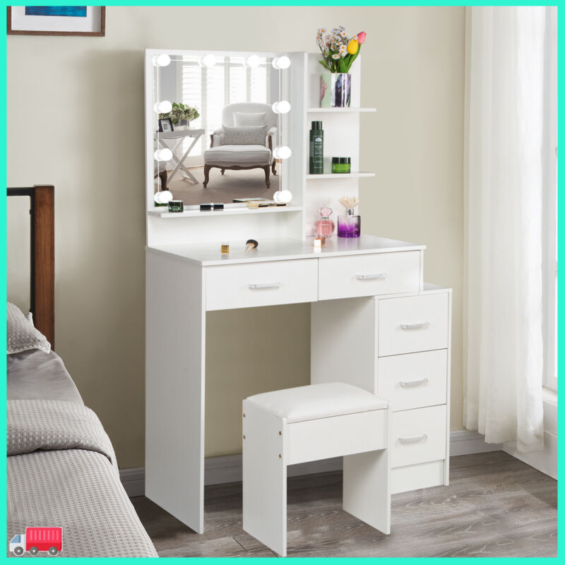 Dressing Table Makeup Vanity Set Mirror with Lights Stool Desk Organizer Dresser