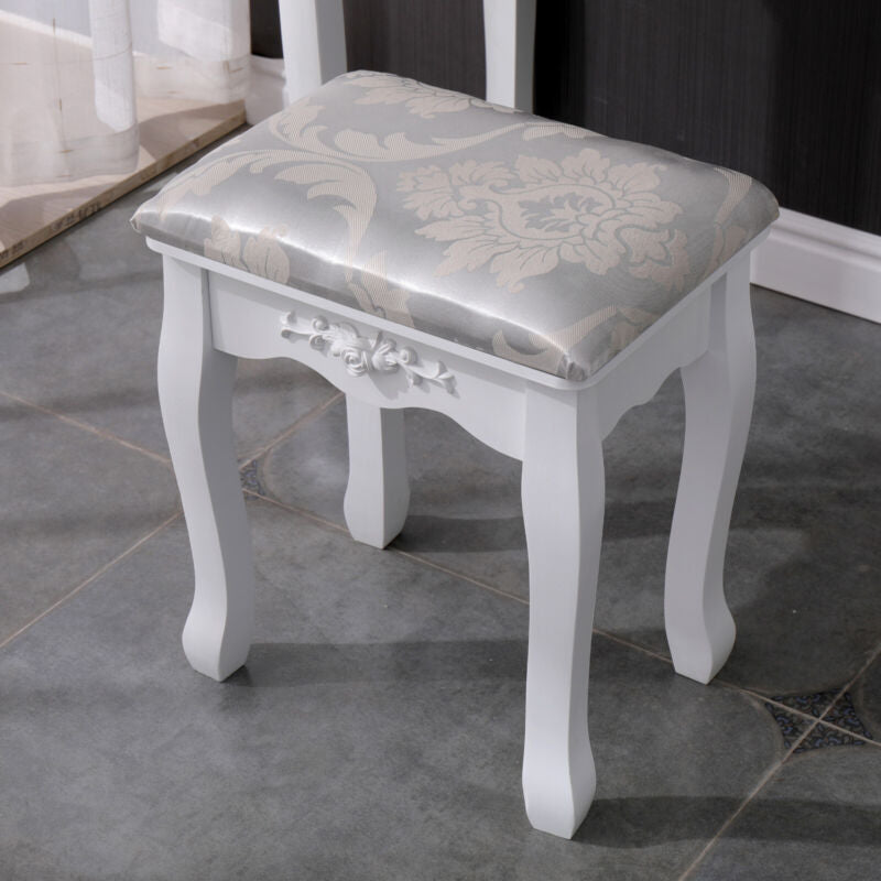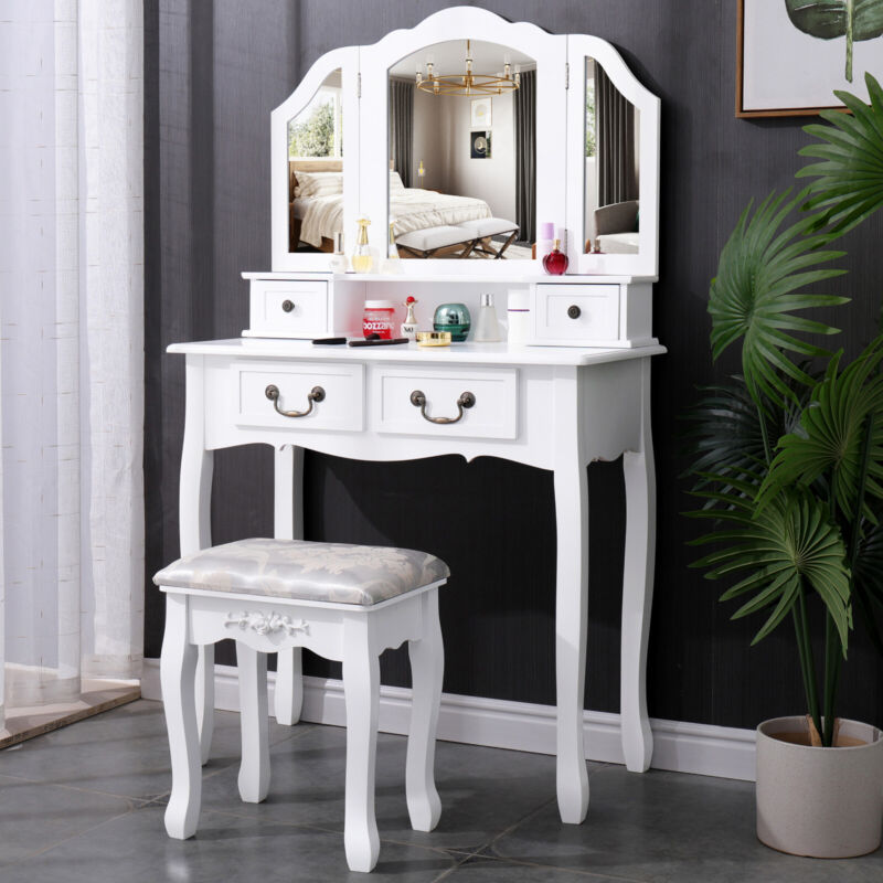 Dressing Table Tri Fold 3 Mirror 4 Drawer & Stool Set Bedroom Vanity Makeup Desk