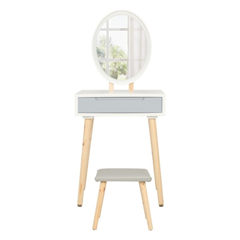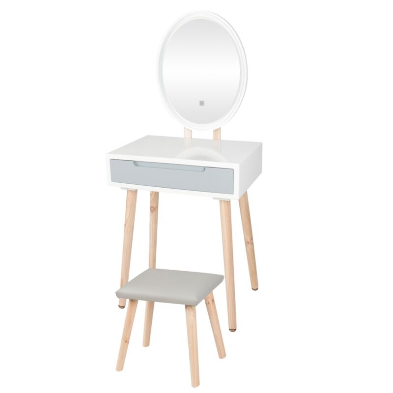 Dressing Table Vanity Set Make up Desk Oval LED Light Mirror with Stool Wood