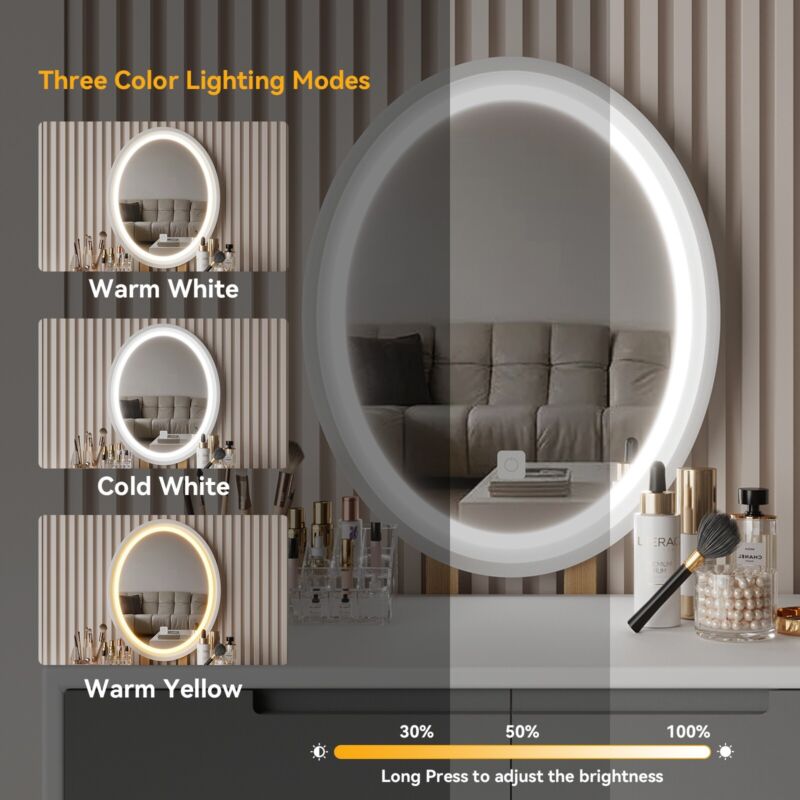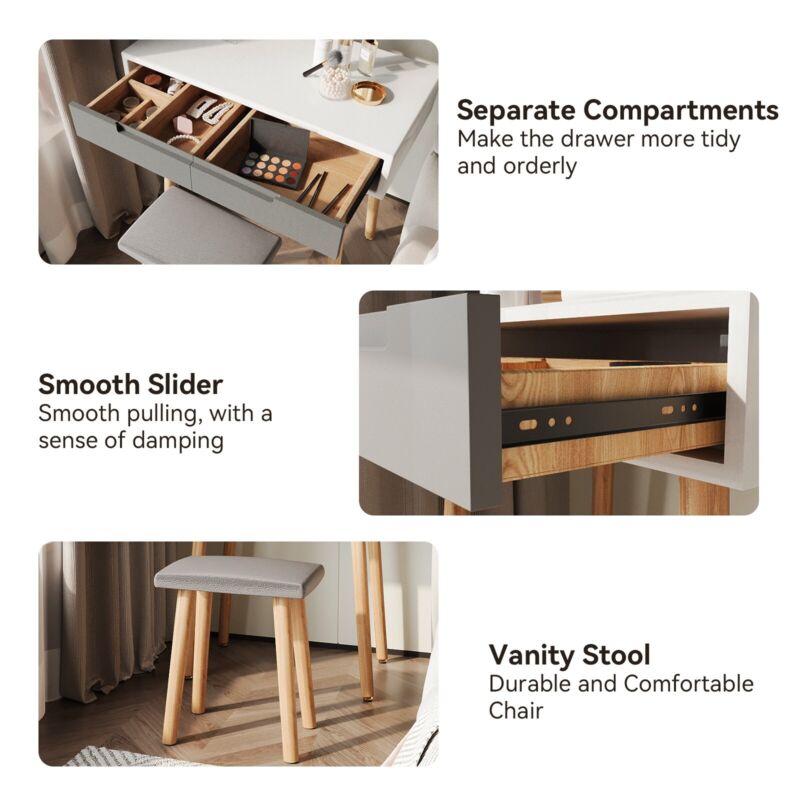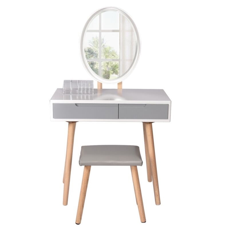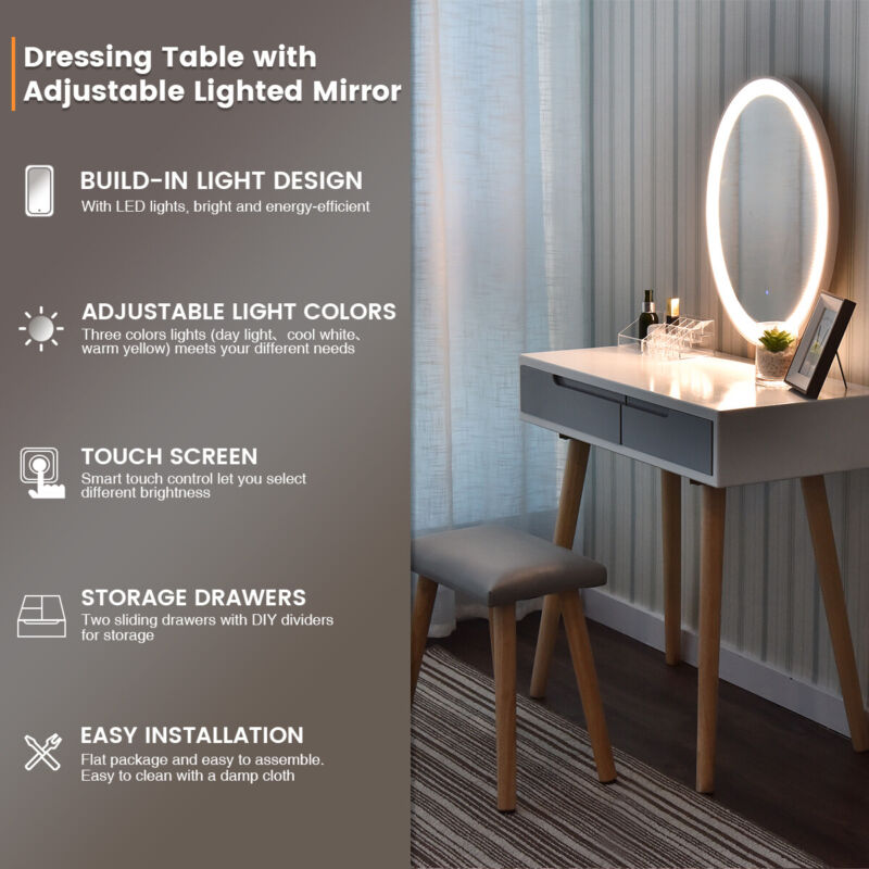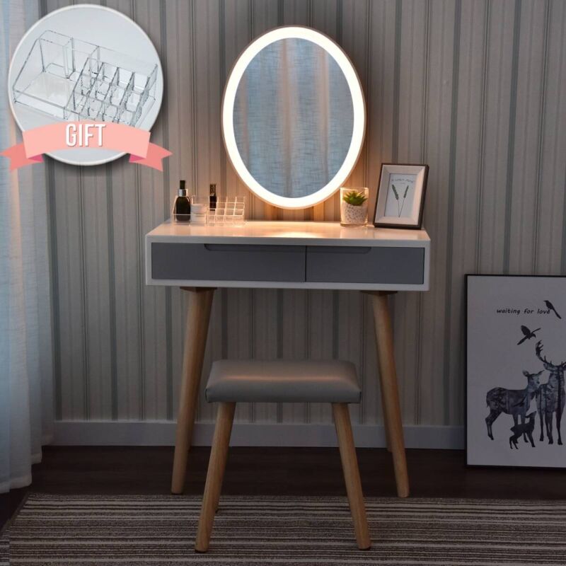 Dressing Table Vanity Set Makeup Desk with Dimmable LED Light Mirror Stool Wood