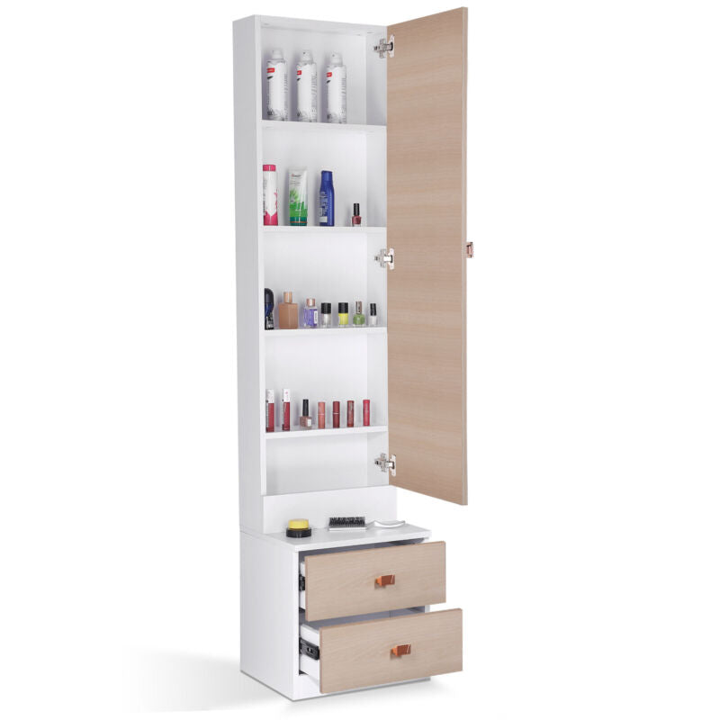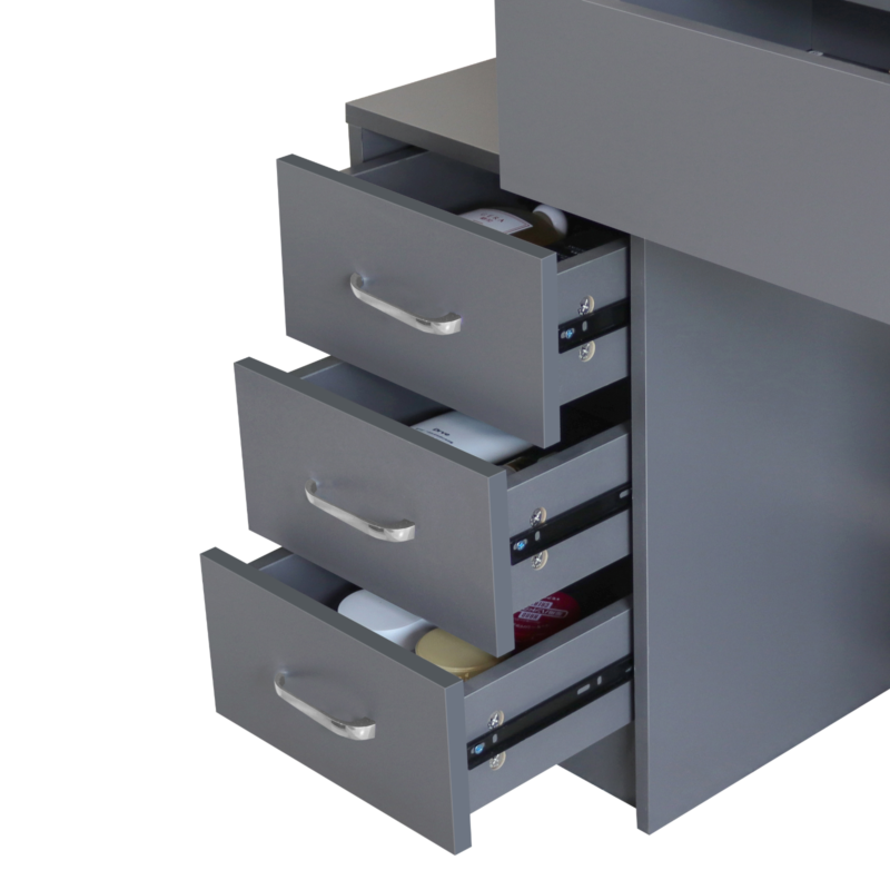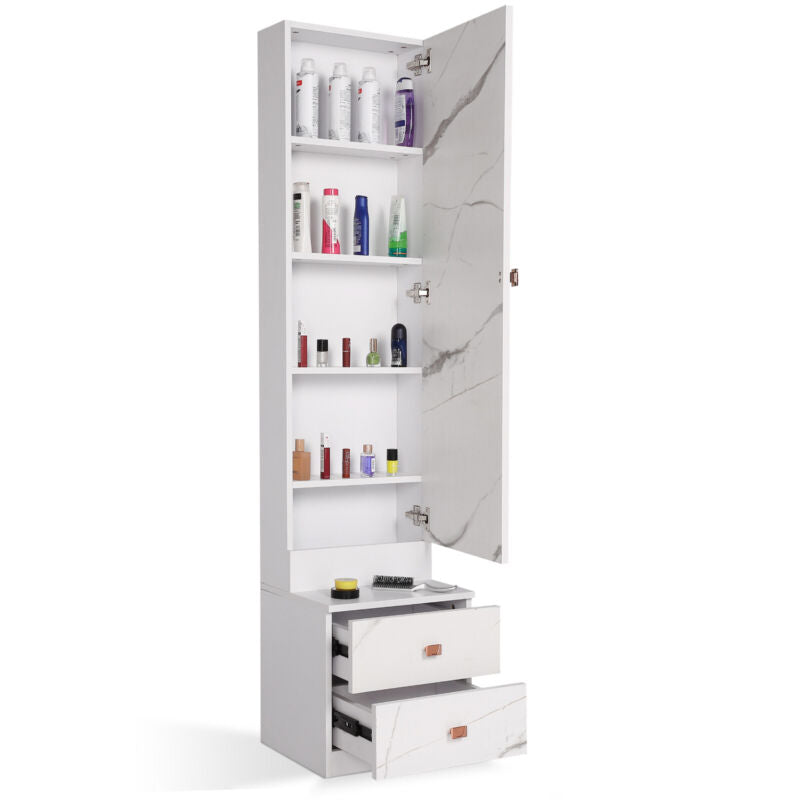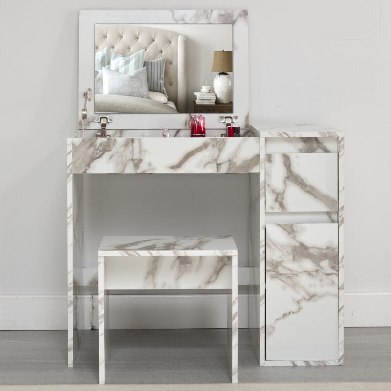 Features Flat Pack, Hidden Storage, High Gloss, Stool Included, With Drawers, With Mirror, With Shelves, With Stool