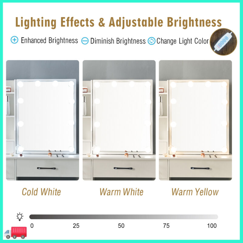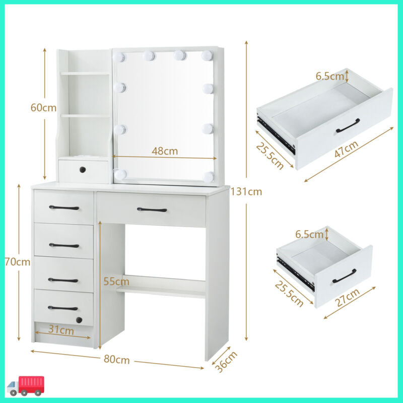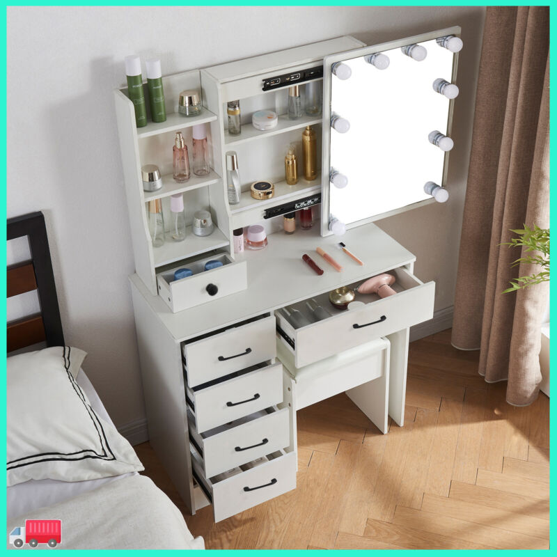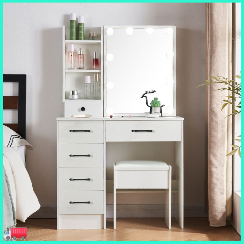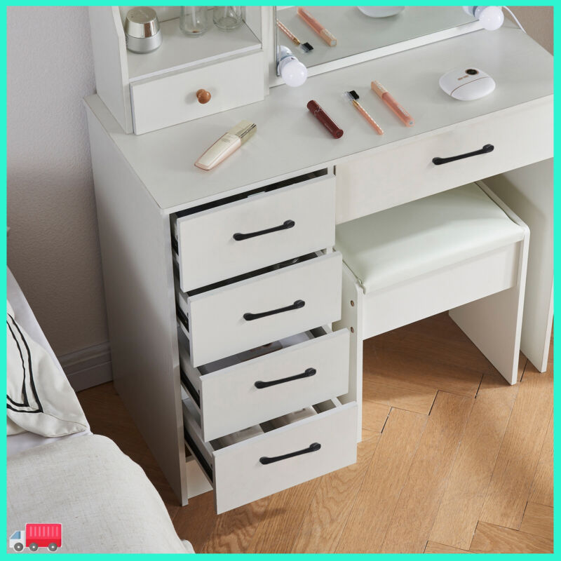Dressing Table With Led Mirror, Drawers Vanity Table Makeup Desk Stool Set White