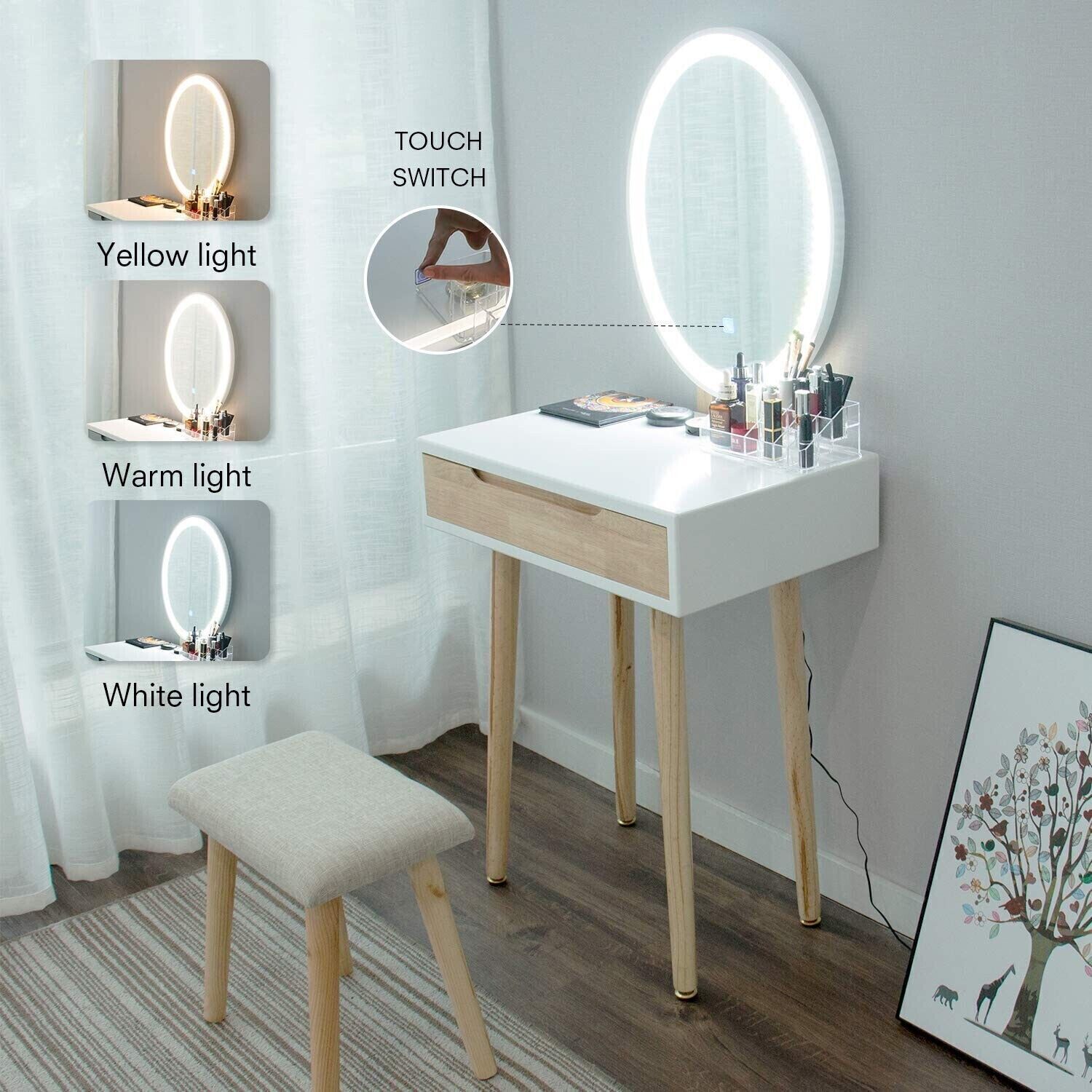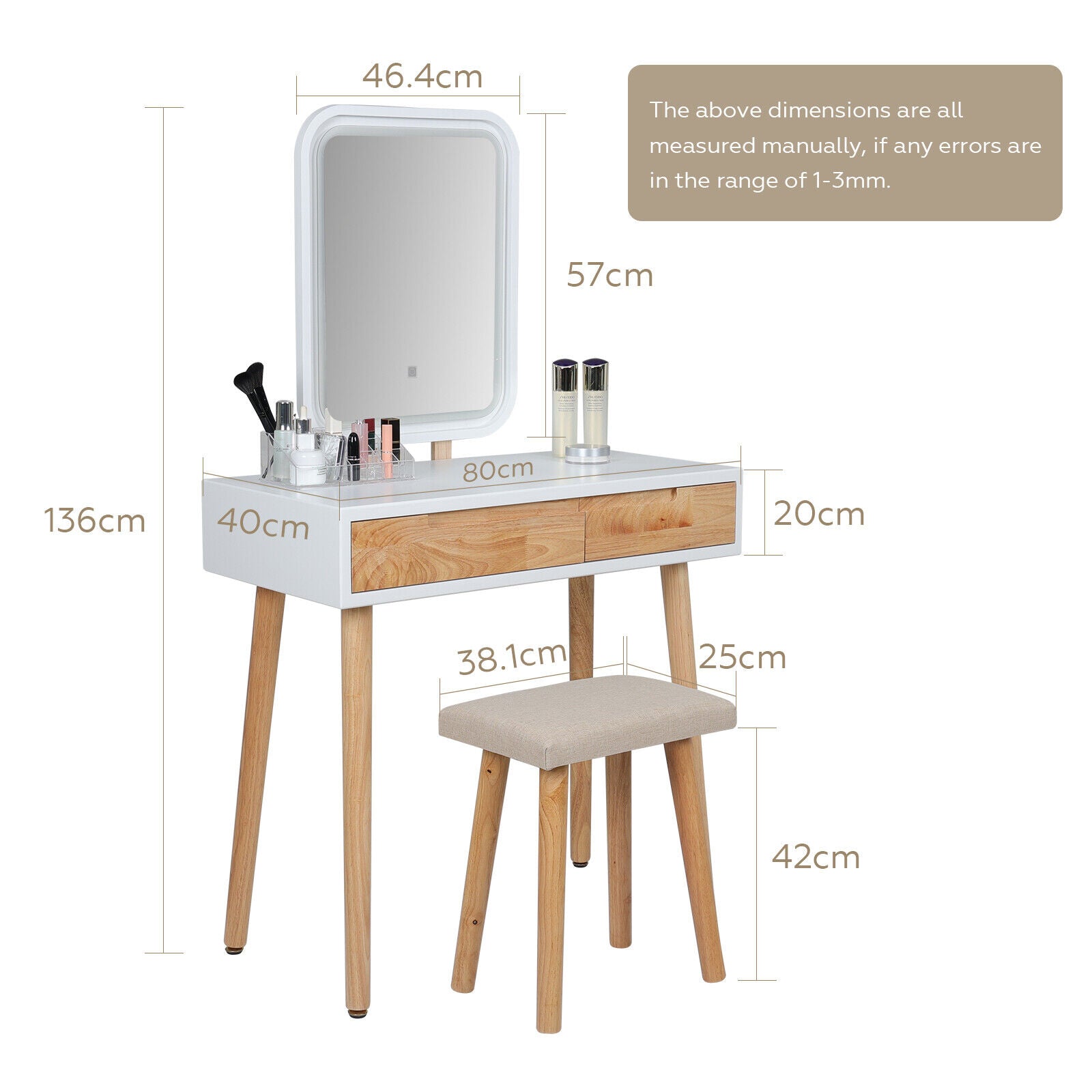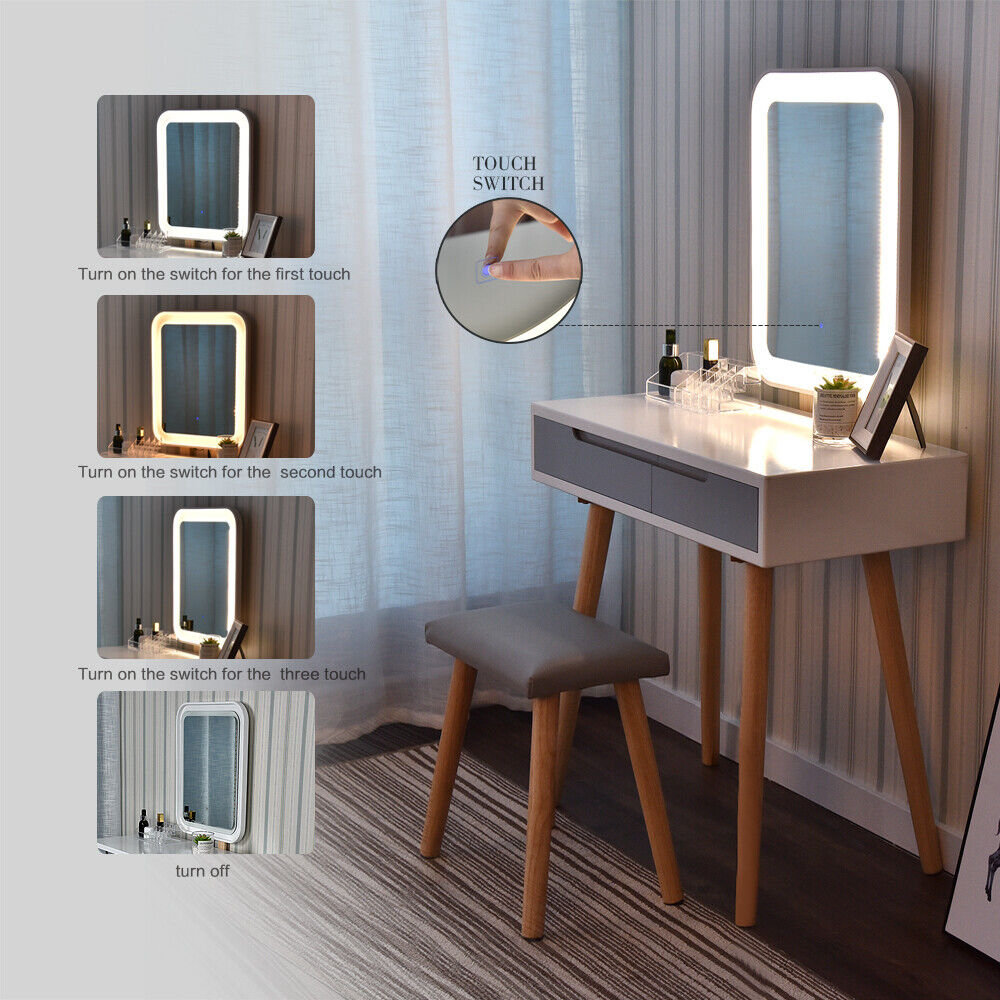 Dressing Vanity Makeup Table Set Cushioned Stool Drawer with LED Lighted Mirror