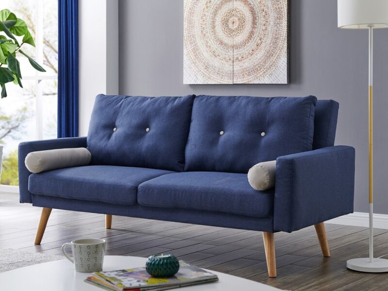 Fabric Sofa Bed 3 Seater Natural Wood Legs Blue With Bolster Cushion Damaged