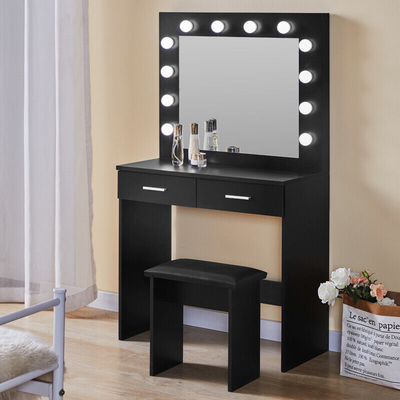 Fashion Black Dressing Table Makeup Desk w/ LED Light Bulbs Mirror Stool Bedroom