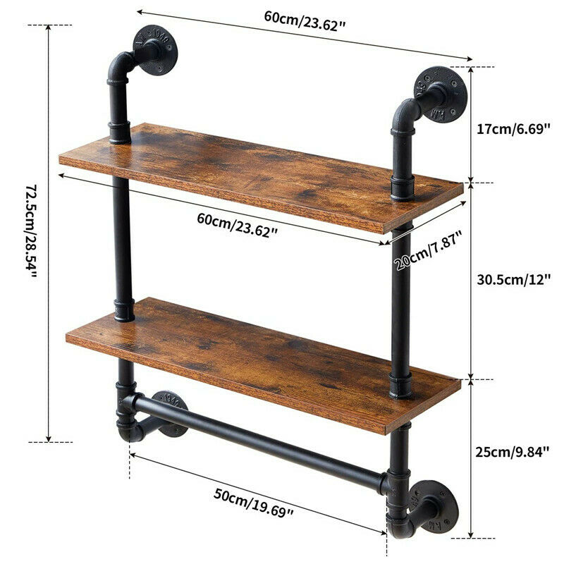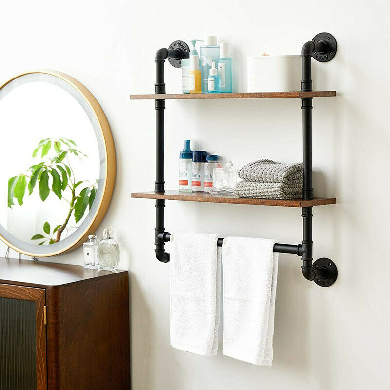 Floating Wall Shelf Industrial Pipe Bathroom Double Rustic Shelf with Towel Rail