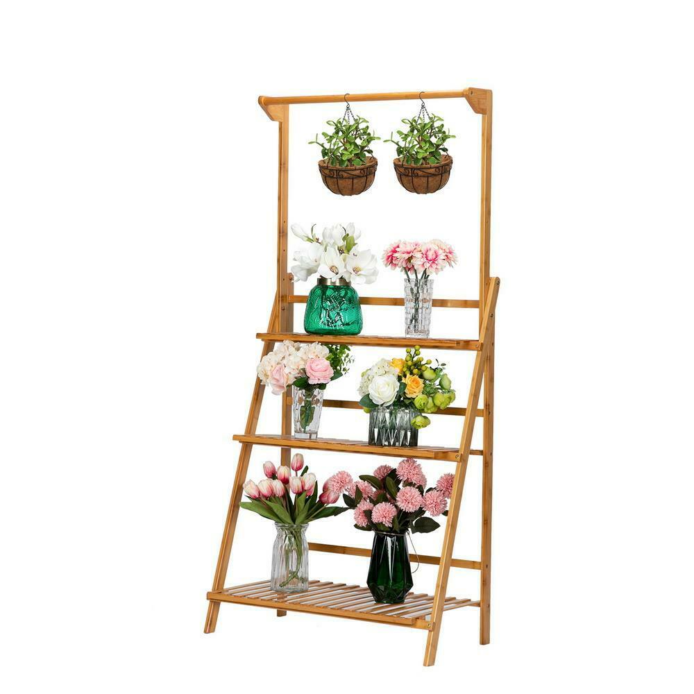 Foldable Bamboo Shelf Bookcase Shelving Unit Plant Stand Display Hanging Rod UK