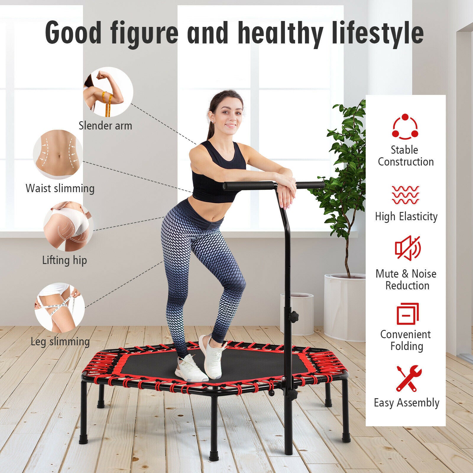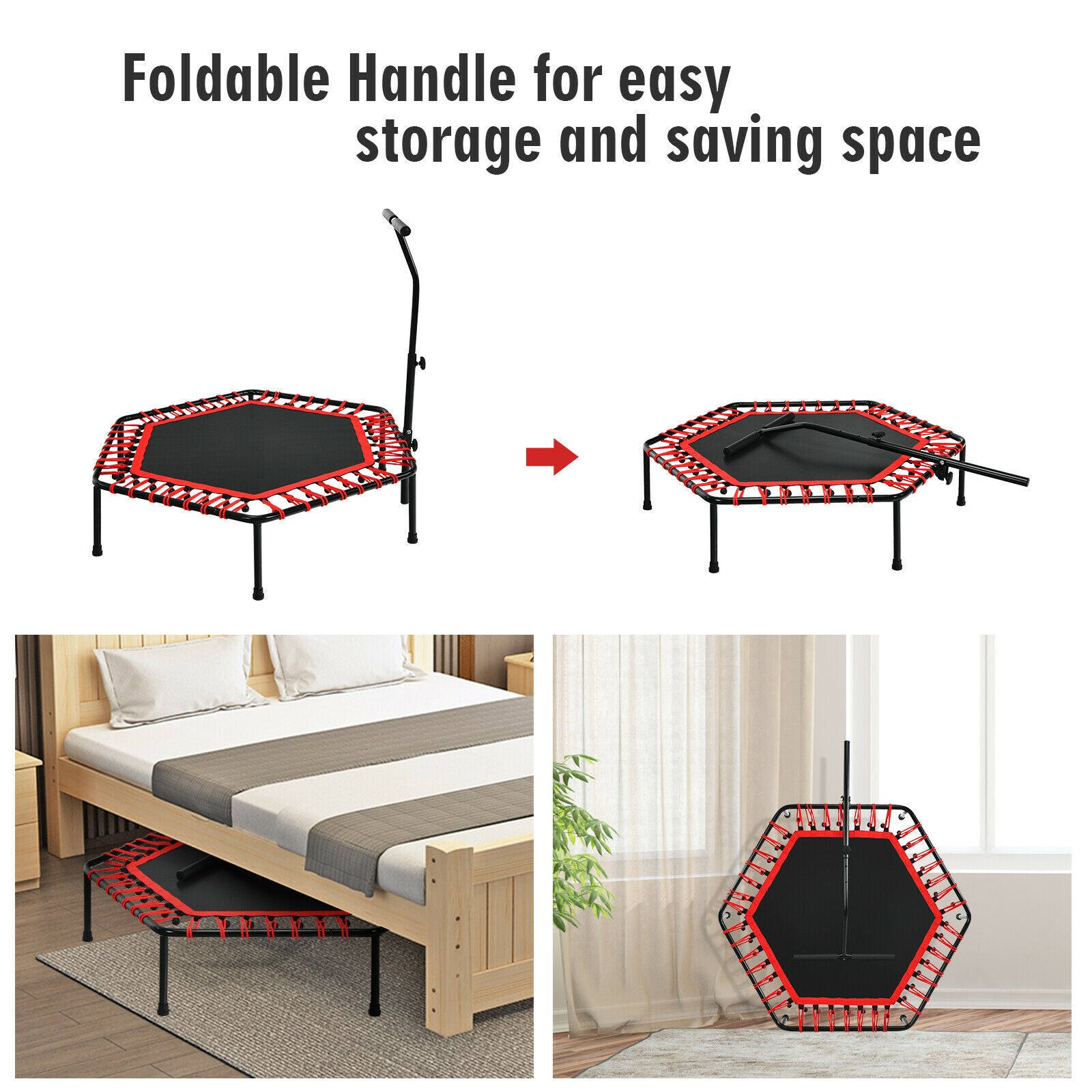 Folding Fitness Trampoline Adults Kids Exercise Bouncer W/ Adjustable Handrail