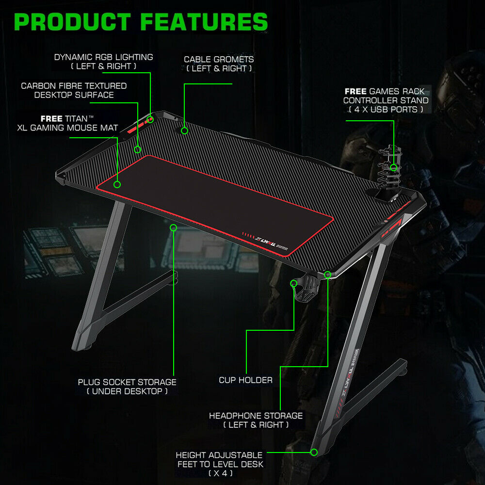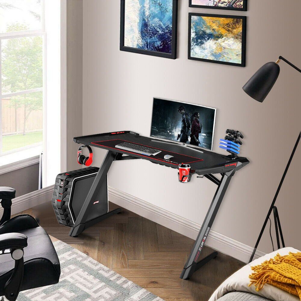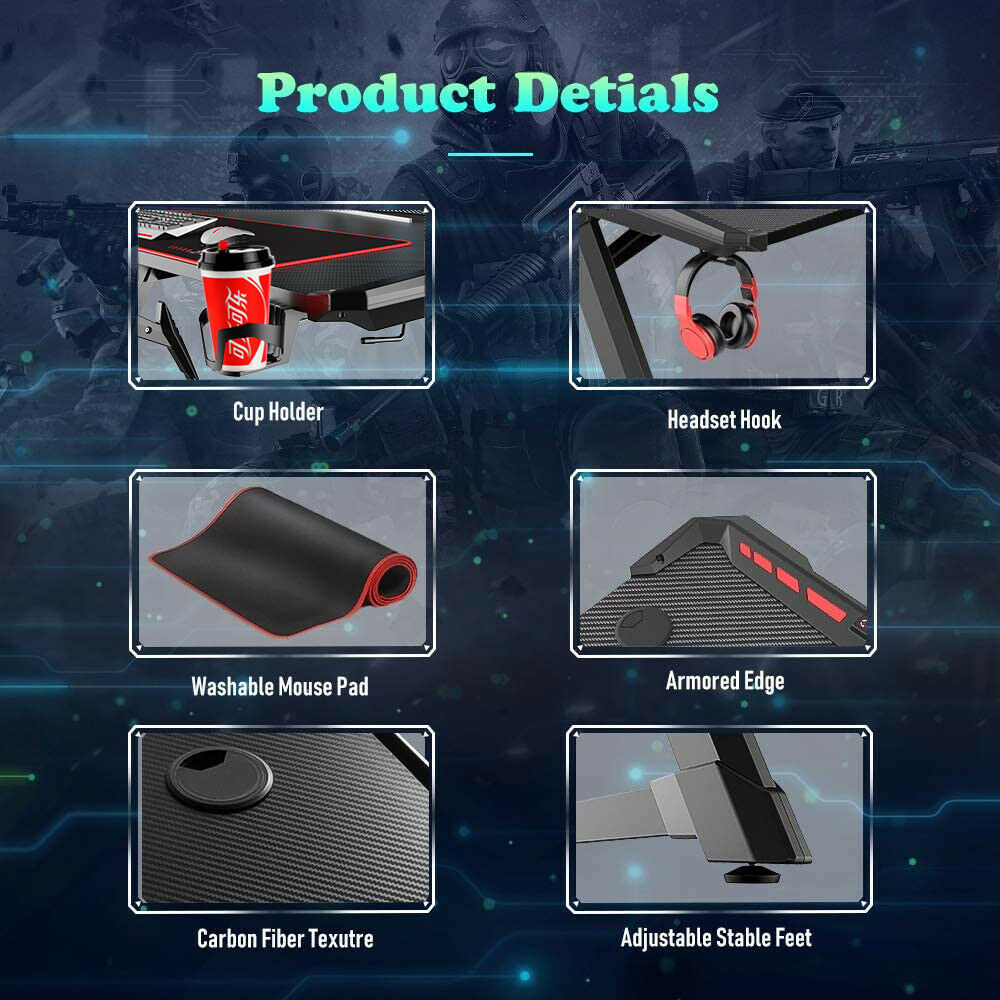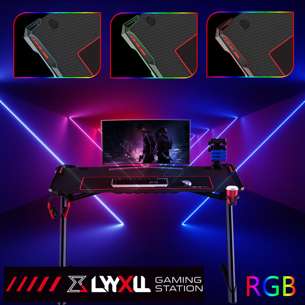 Gaming Table LED Black Computer Racing Desk RGB with Cup Holder Headphone Hook