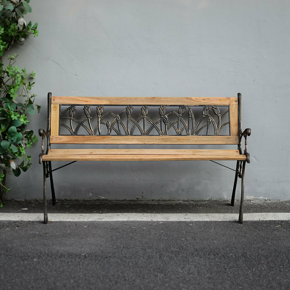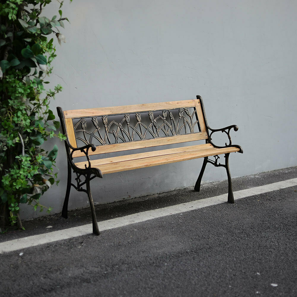 Garden Bench 3 Seater Iron Tulip Back Wood Slat Outdoor Chair Seating Furniture
