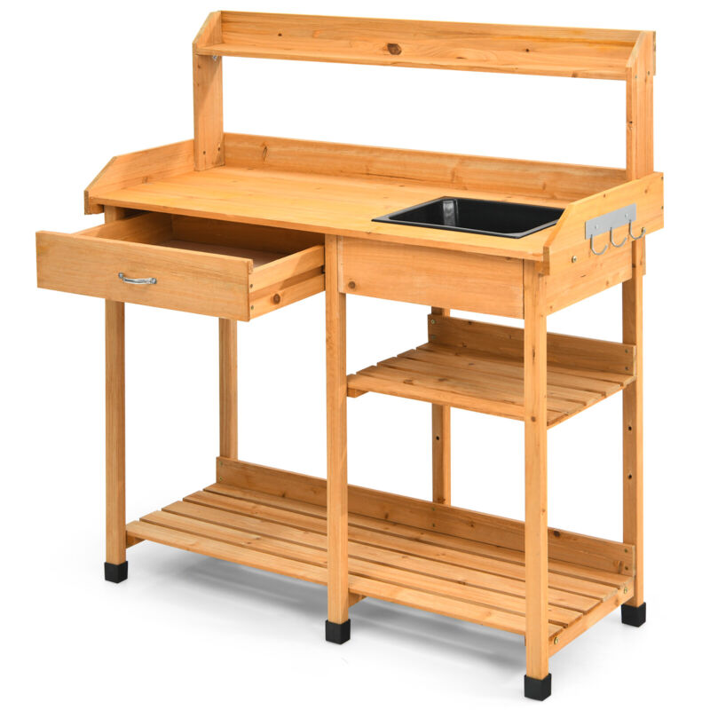 Garden Potting Table Wooden Planting Bench Flower Plant DIY Workstation w/Hooks