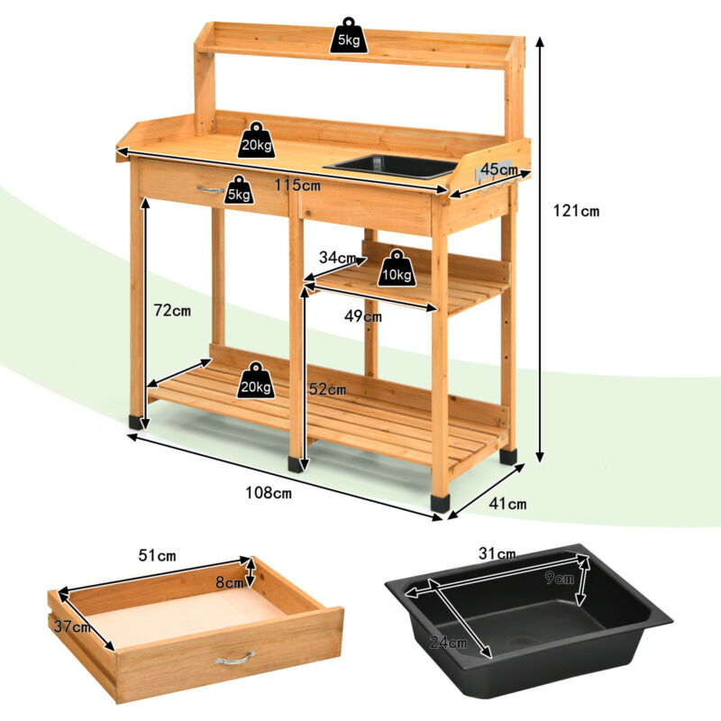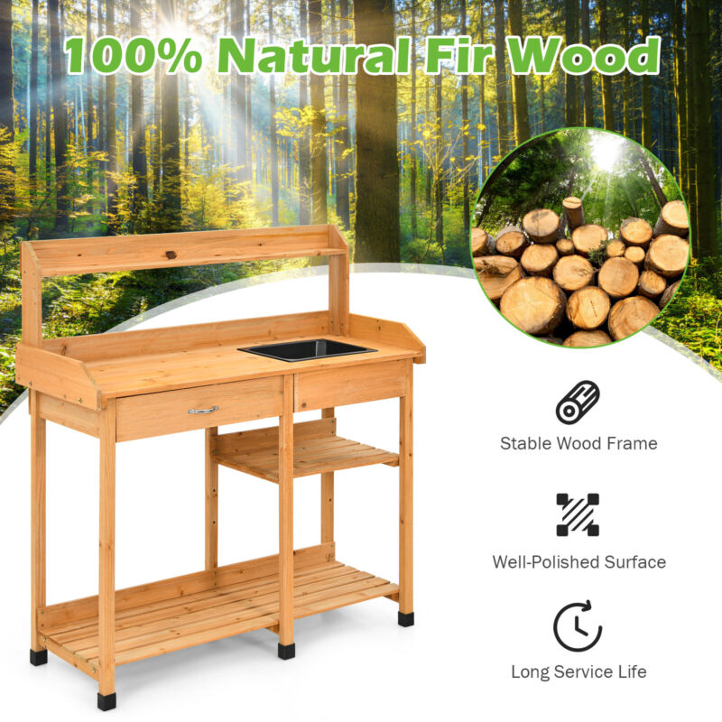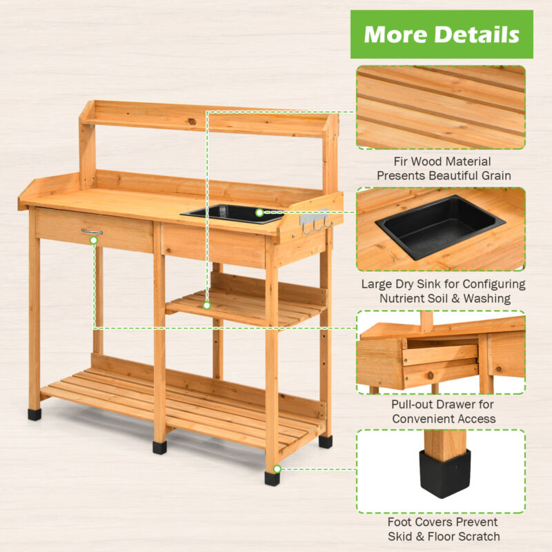 Garden Potting Table Wooden Planting Bench Flower Plant DIY Workstation w/Hooks
