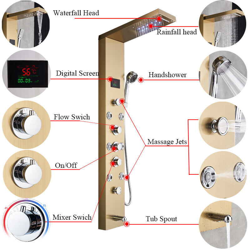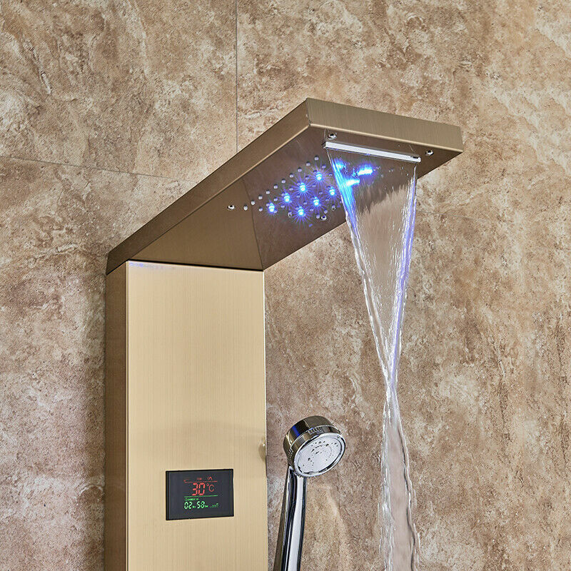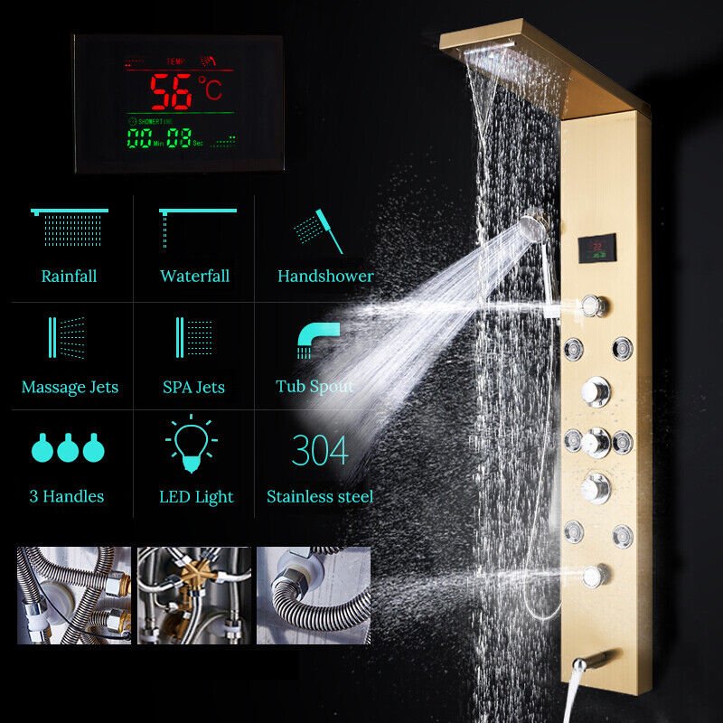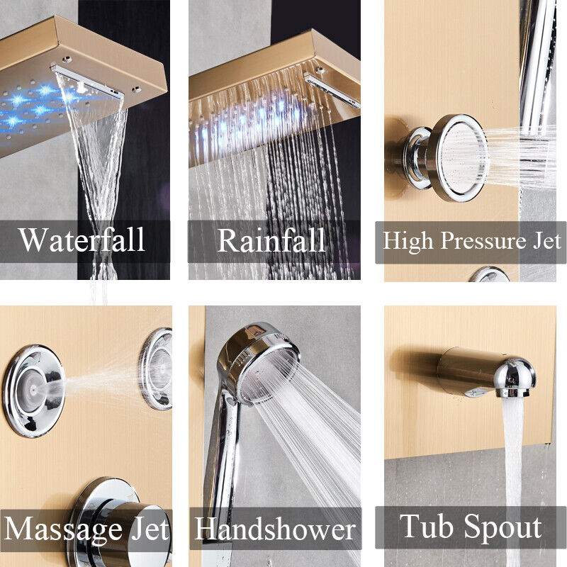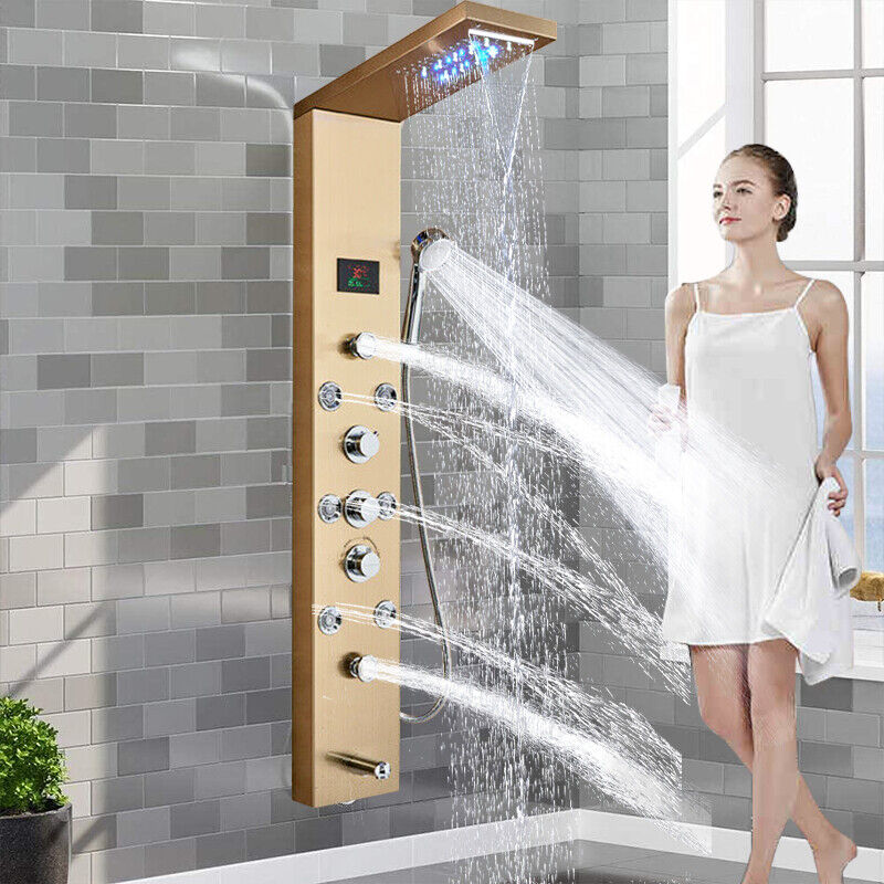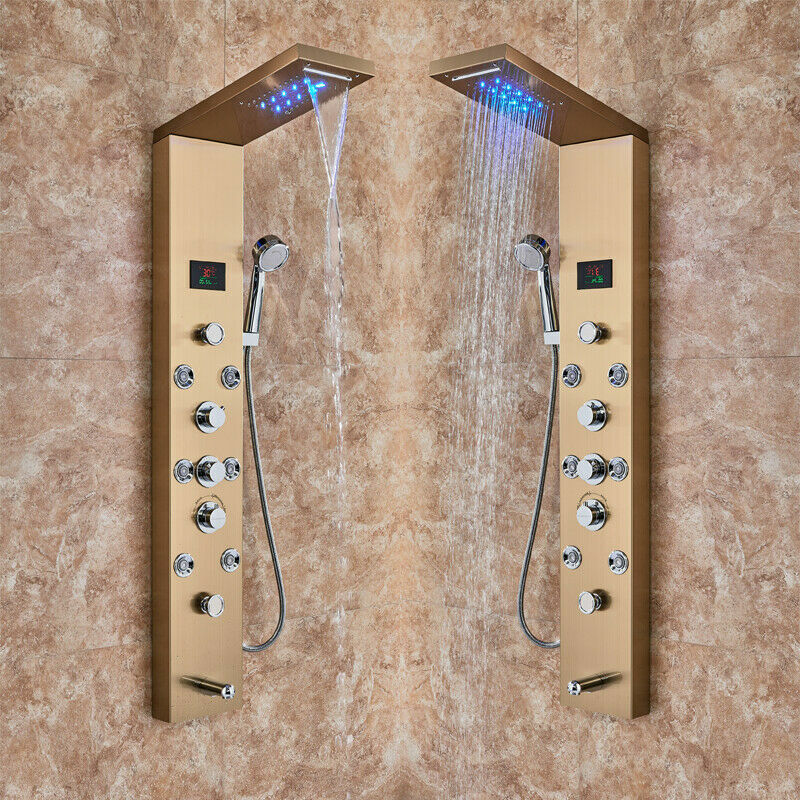 Gold LED Shower Panel Column Tower Massagers Body Jets Bathroom Mixer Taps Wall
