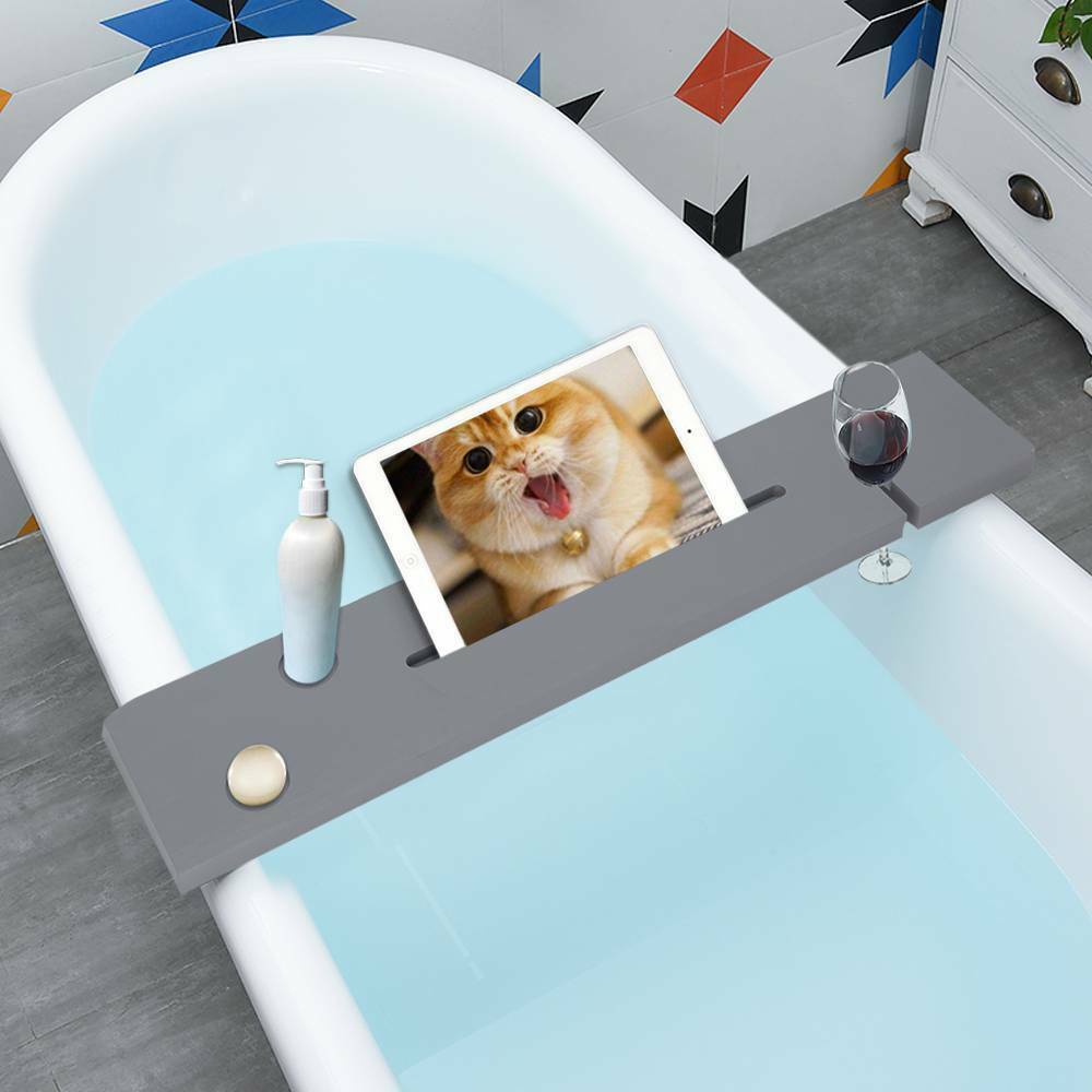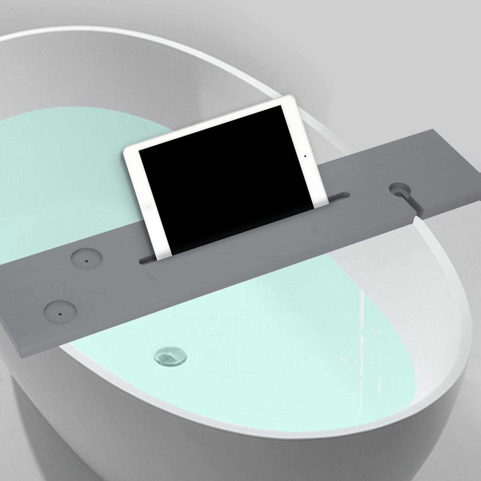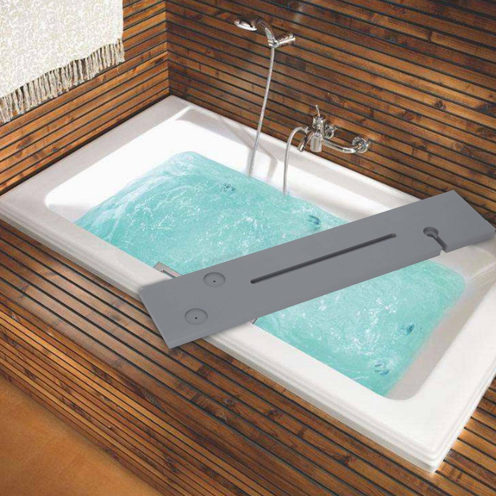 Grey Bamboo Wood Bathroom with the black Tub Rack Bathroom Shelf Tidy Tray Storage Caddy Organiser