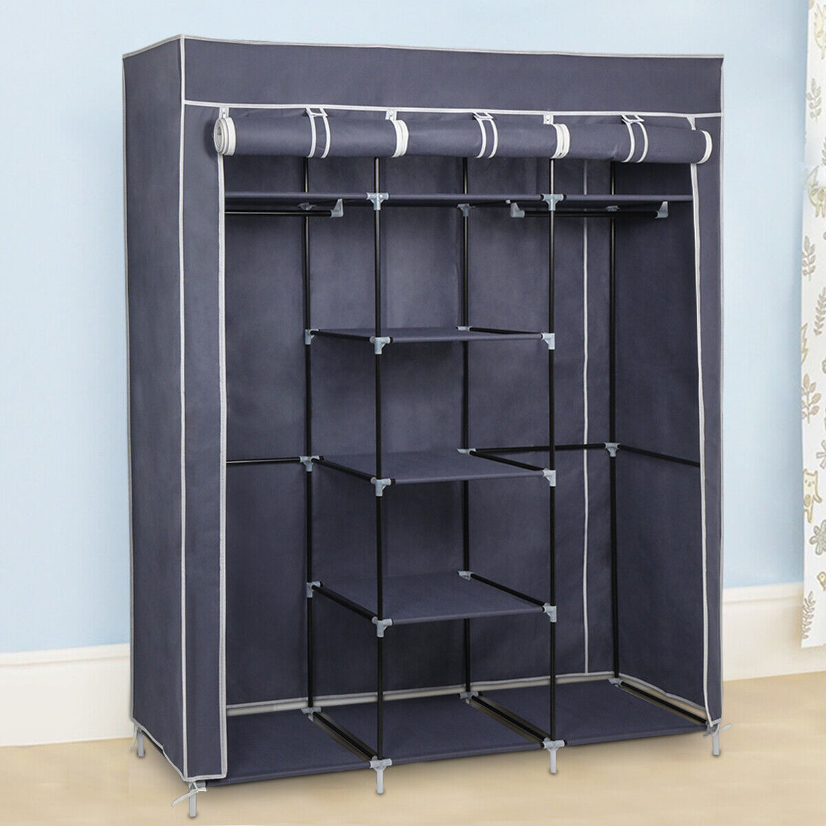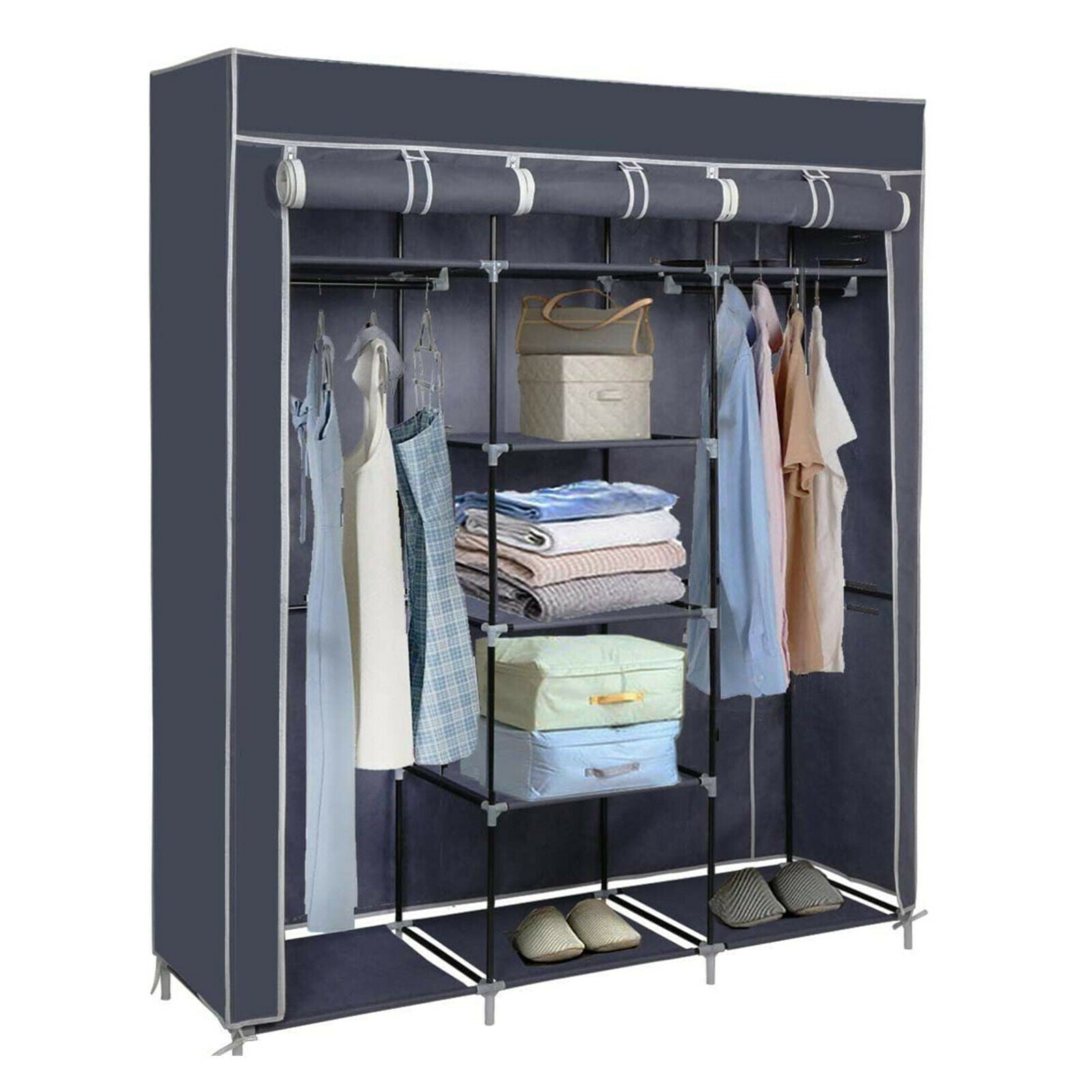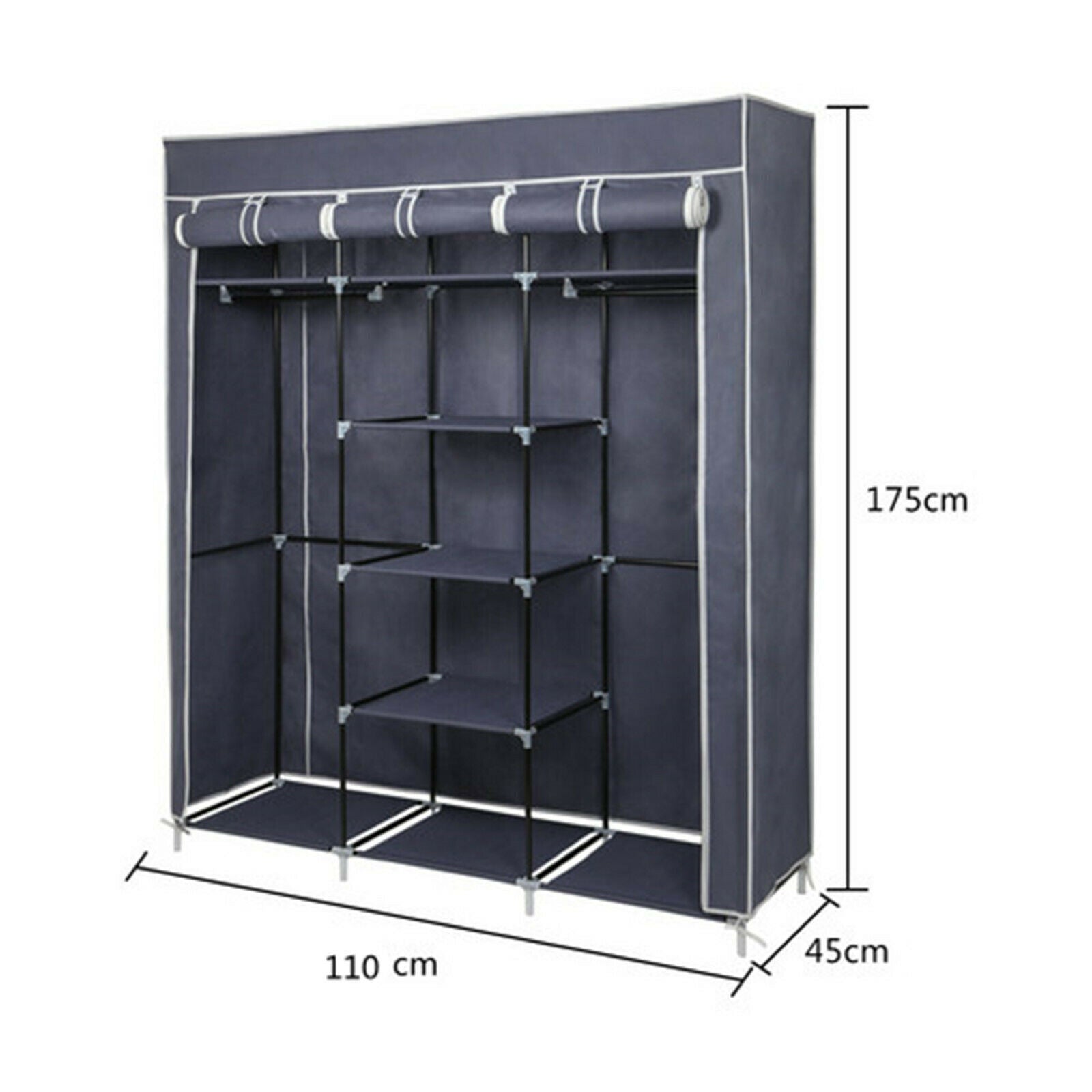 Grey Fabric Canvas Wardrobe With Clothes Hanging Rail Shelves Storage Cupboard