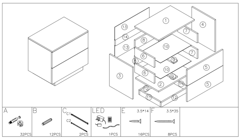 - Features: Flat Pack, 2 Drawers, High Gloss, Matt body